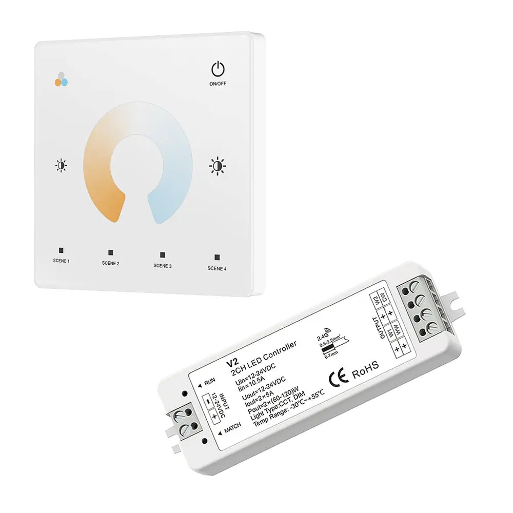 Zestaw ściemniacza LED radiowego CCT Skydance, to gotowy asortyment, składający się z panela naściennego oraz jednego odbiornika LED, umożliwiający sterowanie oświetleniem LED ze zmienną temperaturą barwową CCT (np. taśma LED CCT). Sterownik ten, umożliwia indywidualny dostęp i obsługę jednej strefy, do których możemy uzyskać dostęp przy pomocy dotykowego panela naściennego. Komunikacja z odbiornikami jest w pełni bezprzewodowa, ponieważ wykorzystuje sygnał radiowy na poziomie 2,4GHz.