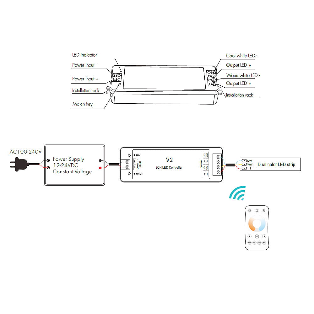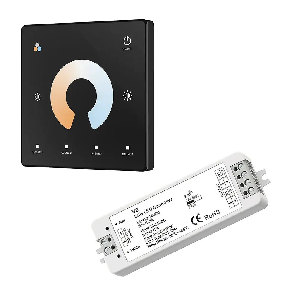 Zestaw ściemniacza LED radiowego CCT Skydance, to gotowy asortyment, składający się z panela naściennego oraz jednego odbiornika LED, umożliwiający sterowanie oświetleniem LED ze zmienną temperaturą barwową CCT (np. taśma LED CCT). Sterownik ten, umożliwia indywidualny dostęp i obsługę jednej strefy, do których możemy uzyskać dostęp przy pomocy dotykowego panela naściennego. Komunikacja z odbiornikami jest w pełni bezprzewodowa, ponieważ wykorzystuje sygnał radiowy na poziomie 2,4GHz.