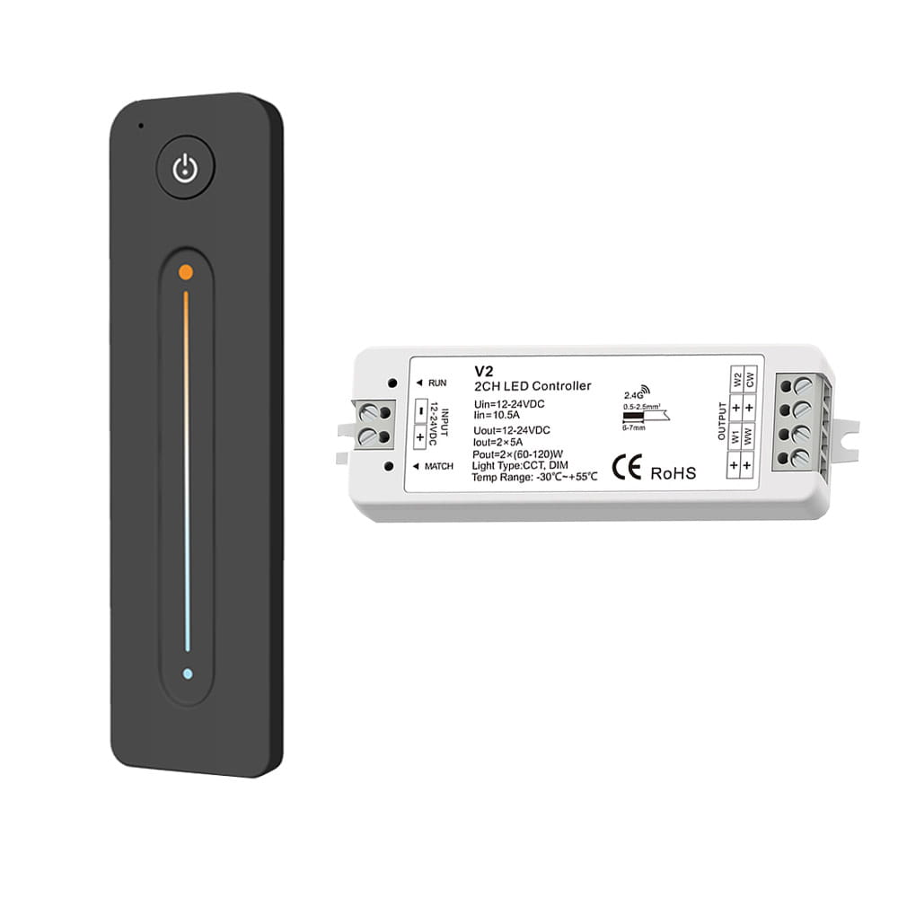 Zestaw ściemniacza LED radiowego CCT Skydance, to gotowy asortyment, składający się z pilota oraz odbiornika LED, umożliwiający sterowanie oświetleniem LED ze zmienną temperaturą barwową CCT (np. taśma led CCT). Ściemniacz ten, umożliwia indywidualny dostęp i obsługę jednej strefy, do której możemy uzyskać dostęp przy pomocy radiowego pilota. Komunikacja z odbiornikiem jest w pełni bezprzewodowa, ponieważ wykorzystuje sygnał radiowy na poziomie 2,4GHz.