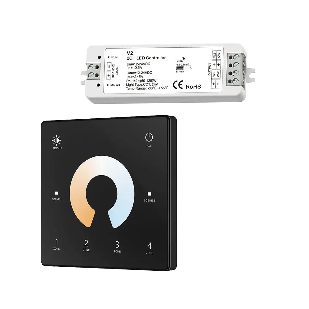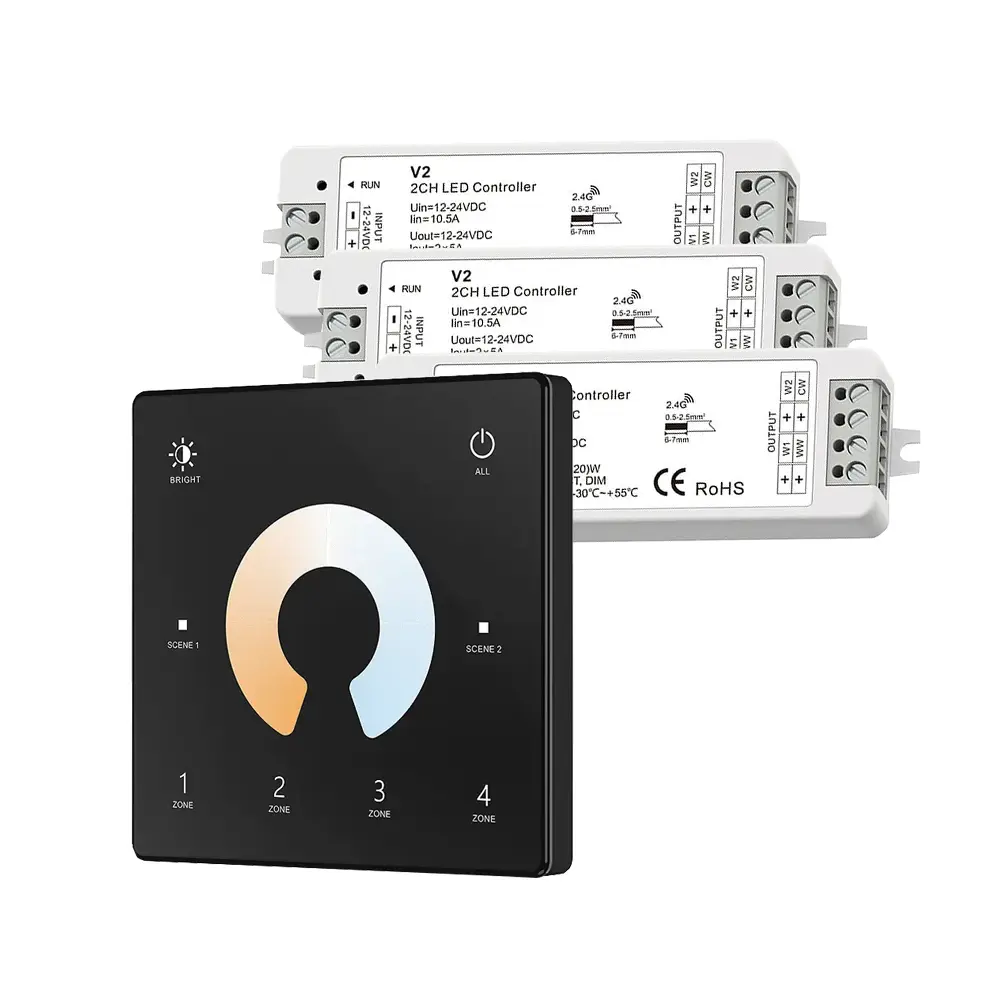 Zestaw ściemniacza LED radiowego CCT Skydance, to gotowy asortyment, składający się z panela naściennego oraz czterech odbiorników LED, umożliwiający sterowanie oświetleniem LED ze zmienną temperaturą barwową CCT (np. taśma LED CCT). Sterownik ten, umożliwia indywidualny dostęp i obsługę czterech stref, do których możemy uzyskać dostęp przy pomocy dotykowego panela naściennego. Komunikacja z odbiornikami jest w pełni bezprzewodowa, ponieważ wykorzystuje sygnał radiowy na poziomie 2,4GHz.