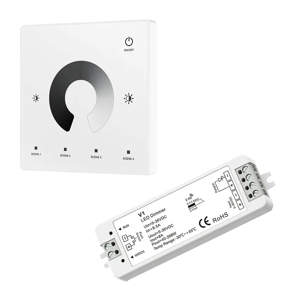 Zestaw ściemniacza LED radiowego MONO Skydance, to gotowy asortyment, składający się z panela naściennego oraz odbiornika LED, który umożliwia sterowanie monochromatycznym oświetleniem LED (np. taśma led jednokolorowa MONO). Ściemniacz ten, umożliwia indywidualny dostęp i obsługę jednej strefy, do której możemy uzyskać dostęp przy pomocy dotykowego panela naściennego. Komunikacja z odbiornikiem jest w pełni bezprzewodowa, ponieważ wykorzystuje sygnał radiowy na poziomie 2,4GHz.