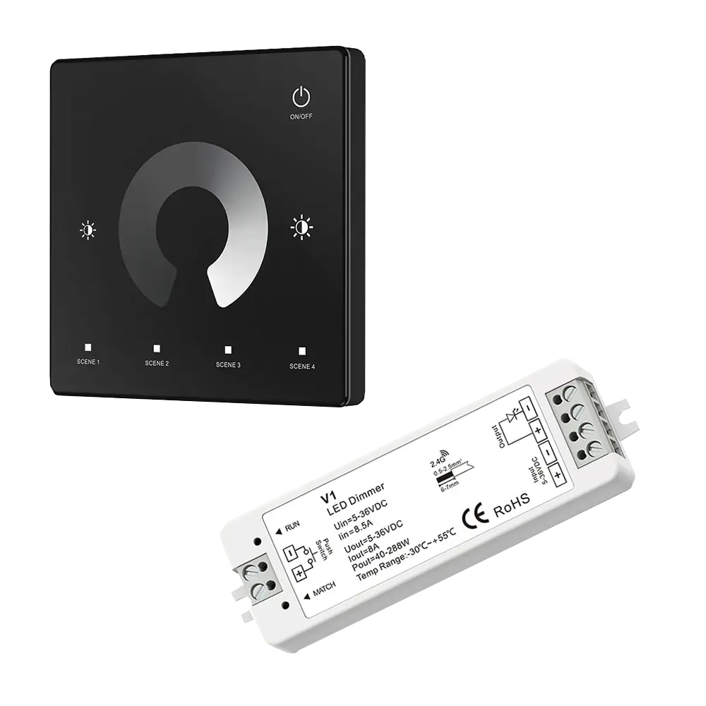 Zestaw ściemniacza LED radiowego MONO Skydance, to gotowy asortyment, składający się z panela naściennego oraz odbiornika LED, który umożliwia sterowanie monochromatycznym oświetleniem LED (np. taśma led jednokolorowa MONO). Ściemniacz ten, umożliwia indywidualny dostęp i obsługę jednej strefy, do której możemy uzyskać dostęp przy pomocy dotykowego panela naściennego. Komunikacja z odbiornikiem jest w pełni bezprzewodowa, ponieważ wykorzystuje sygnał radiowy na poziomie 2,4GHz.