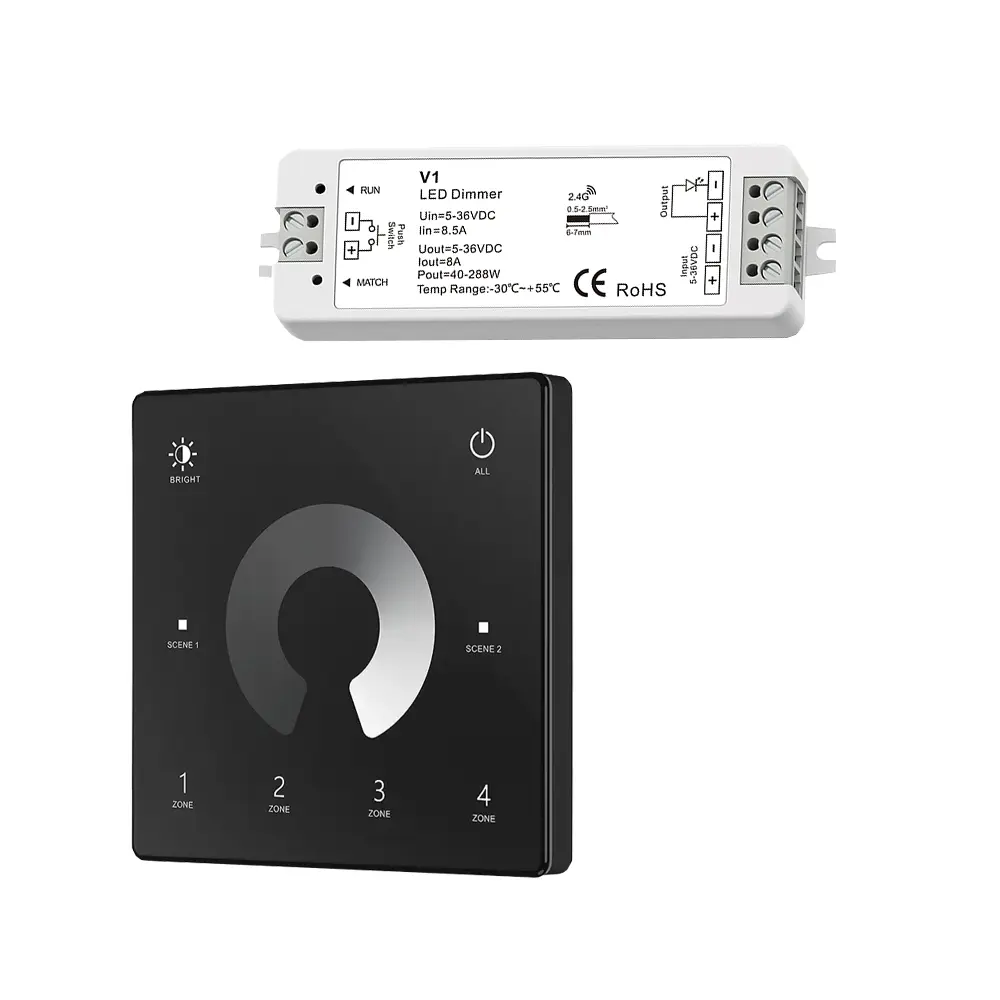 Zestaw ściemniacza LED radiowego MONO Skydance, to gotowy asortyment, składający się z panela naściennego oraz czterech odbiorników LED, umożliwiający sterowanie monochromatycznym oświetleniem LED (np. taśma led jednokolorowa MONO). Ściemniacz ten, umożliwia indywidualny dostęp i obsługę czterech stref, do których możemy uzyskać dostęp przy pomocy dotykowego panela naściennego. Komunikacja z odbiornikami jest w pełni bezprzewodowa, ponieważ wykorzystuje sygnał radiowy na poziomie 2,4GHz.