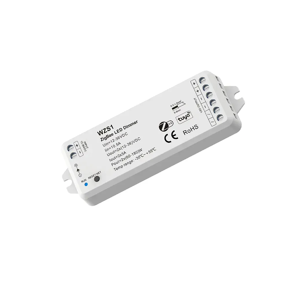 Ściemniacz LED (ZigBee 3.0) - Mono - 12-36V DC 10A - Tuya - WZS1, to bezprzewodowy kontroler led w formie autonomicznego ściemniacza led, który umożliwia sterowanie oświetleniem LED składającym się z monochromatycznego oświetlenia (np. taśma LED jednokolorowa bez pomocy dodatkowych urządzeń. Cechuje się szerokim zakresem napięcia wejściowego/wyjściowego 12-36V DC oraz obciążalnością wyjściową równą 10A. Ściemniacz led WZS1 pozwala na ściemnianie/rozjaśnianie oraz włączanie i wyłączanie z wykorzystaniem komunikacji opartej na protokole ZigBee 3.0. Ściemniacz led WZS1 pozwala również na komunikacje z aplikacją Tuya, przeznaczoną na nasze urządzenia mobilne (np. smartfony). Sterownik LED WZS1, został wykonany z wysokiej jakości komponentów, które są poprzedzone pięcioletnim okresem gwarancyjnym.