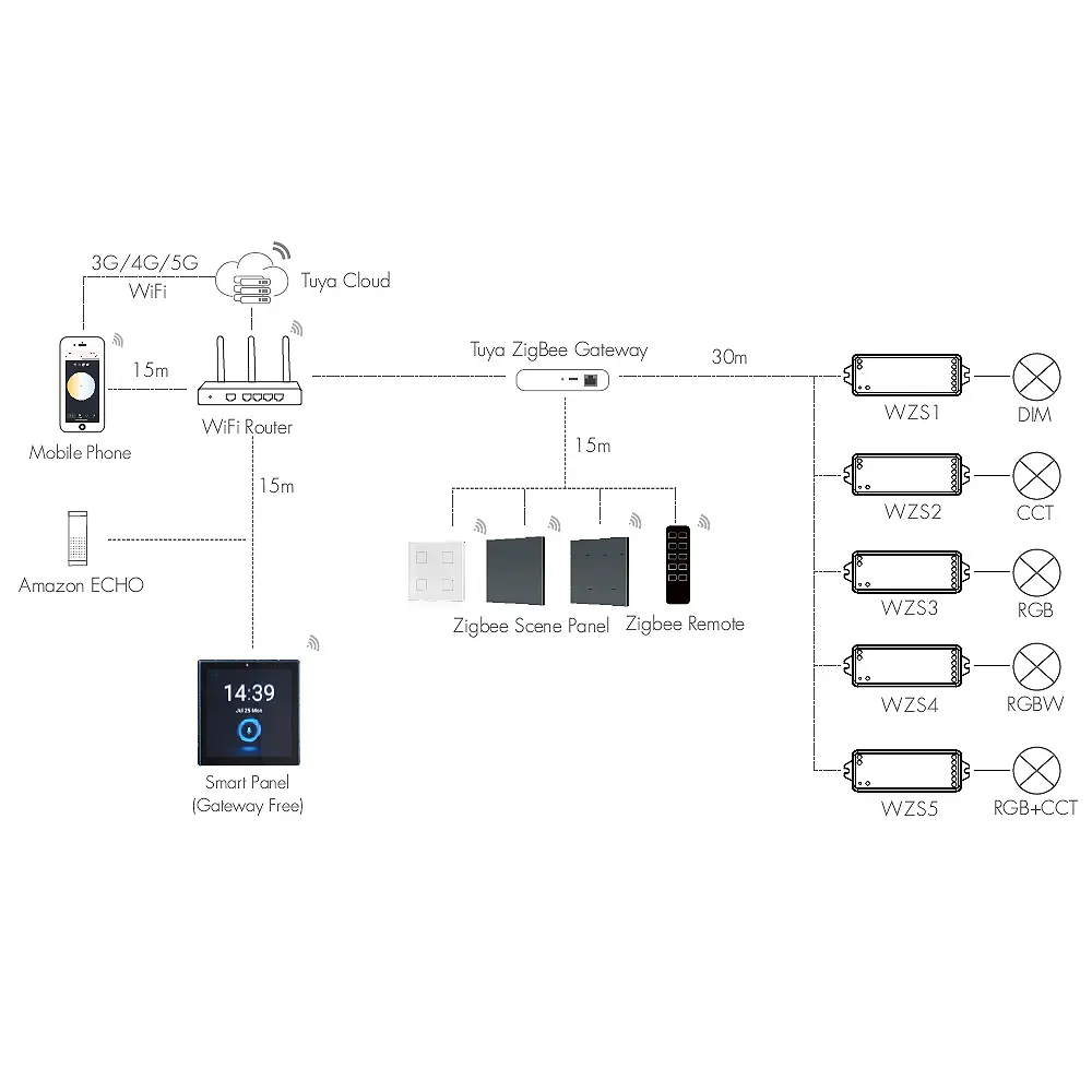 Możliwość wykorzystania sterowników LED WZS do każdej instalacji LED, to ogromny atut pozwalający nam na wykorzystanie tych produktów do każdej taśmy LED. Za równo tych jednokolorowych z możliwością ściemniania bądź rozjaśniania, wielokolorowych RGB z dostępem do każdego koloru czy wielokolorowych z możliwością zmiany temperatury barwowej RGB+CCT. Seria WZS posiada również możliwość dołączenia paneli naściennych zigbee 3.0 czy pilotów radiowych LED zigbee 3.0, które wspierają protokół zigbee 3.0. Sterowniki z tej serii posiadają zazwyczaj mechaniczne bądź dotykowe przyciski, które pracują jako sceny, a więc mogą realizować wiele funkcji jednocześnie. Współpracują również z takimi systemami głosowymi jak Amazon Alexa, Google Assistant, Tmall Genie and Xiaodu, które możemy zsynchronizować z systemem Philips Hue czy Tuya Smart.