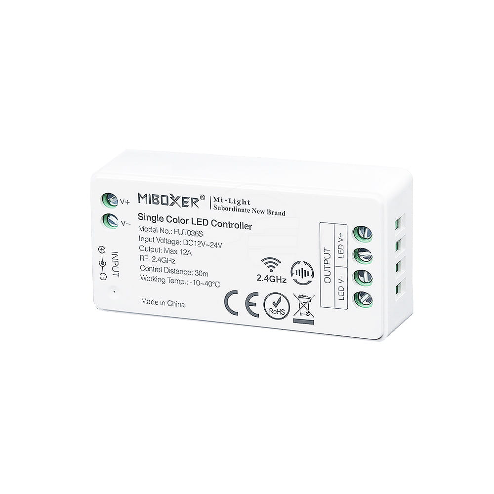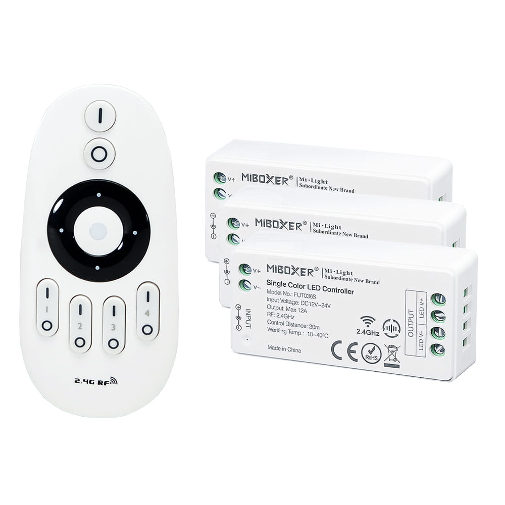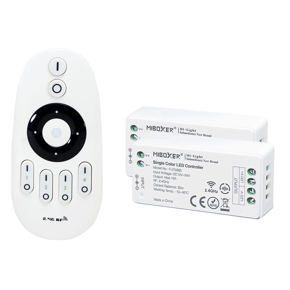 Zestaw ściemniacza LED radiowego MONO, to gotowy asortyment, składający się z pilota oraz odbiorników LED (dostępnych w wariantach), umożliwiający sterowanie jednokolorowym oświetleniem LED (taśma monochromatyczna). Sterownik ten, umożliwia indywidualny dostęp i obsługę do czterech stref, które można w odrębny sposób sterować przy pomocy radiowego pilota. Komunikacja z odbiornikami jest w pełni bezprzewodowa ponieważ wykorzystuje sygnał radiowy na poziomie 2,4GHz.