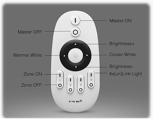 W zależności od modelu urządzenia nadawczego, które występuje głównie jako pilot łączący się drogą radiową z odbiornikiem, możemy uzyskać różne funkcje sterowania. Znajdująca się na środku dotykowa tarcza pełni główną funkcje sterowania, to właśnie poprzez nią możemy m.in w szybki sposób zmienić natężenie światła bądź też temperaturę barwową w pomieszczeniu. Na samej górze pilotów, znajdują się przyciski odpowiadające za włączenie/wyłączenie wszystkich dostępnych stref w naszej instalacji LED. Przyciski odpowiadające za włączenie/wyłączenie danej strefy natomiast znajdują się na dole urządzenia ułożone obok siebie. Budowa wielostrefowych pilotów, skonstruowana jest w prosty sposób, przez co dostęp do najważniejszych funkcji jest wygodny.