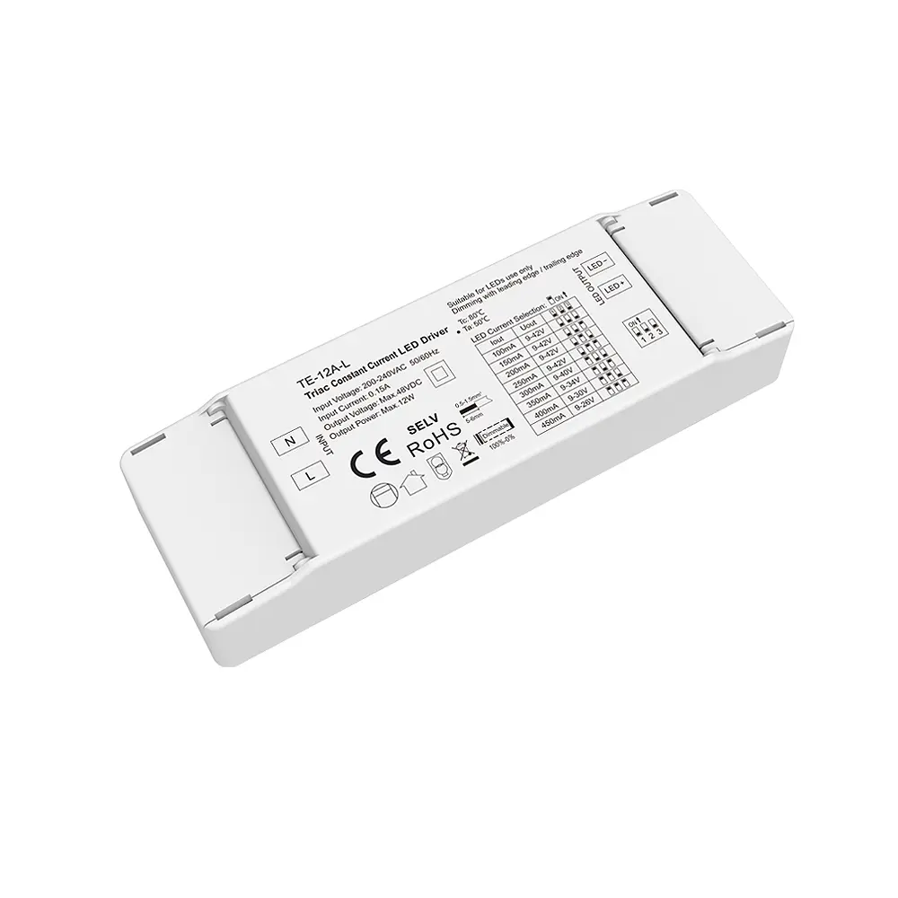 Ściemniacz z zasilaczem prądowym LED 12W - 100-450mA 9-45V - sterowanie triak 230V - TE-12A-L, to urządzenie zasilające o określonym prądzie rzędu od 100 do 450mA, które posiada wbudowany ściemniacz LED umożliwiający ściemnianie bądź rozjaśnianie podłączonego prądowego źródła światła (np. diody LED) Urządzenie zasilające, to nic innego jak zasilacz stało prądowy o napięciu znamionowym 9-45V oraz mocą wyjściową rzędu 12W. Ściemnianie oświetleniem LED odbywa się poprzez ściemniacz triakowy 230V podłączany bezpośrednio do wejścia zasilacza TE-12A-L. Zastosowanie tego typu urządzenia, to ciekawa alternatywa dla tworzenia niewielkich instalacji opartych na oświetleniu LED o określonym prądzie wyjściowym, bowiem pozwala ono na kontrole oświetlenia LED bez dodatkowych urządzeń.