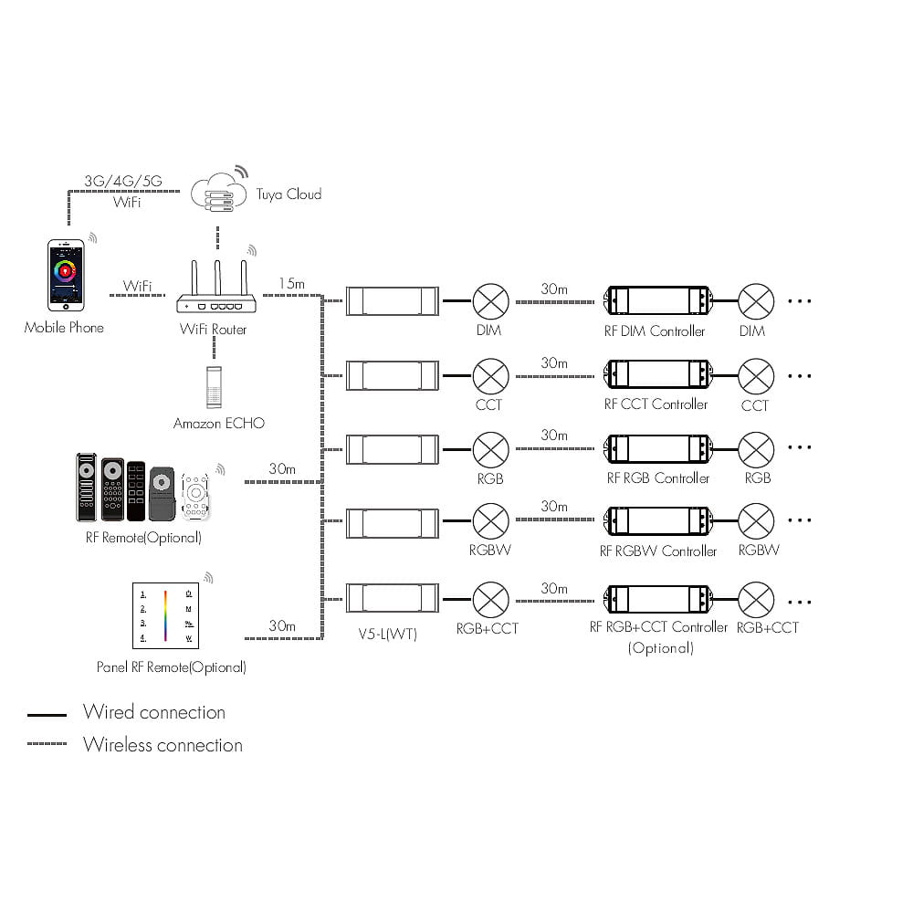 Charakterystyczną cechą sterownika led V5-L(WT) jest przede wszystkim innowacyjne podejście do sterowania oświetleniem LED. Posiada on bowiem możliwość komunikacji z dwoma systemami nowoczesnego sterowania Amazon Alexa oraz Tuya. Pierwszy z nich pozwala na wypowiadanie komend i uzyskanie sterowania przy użyciu naszego głosu. Tuya natomiast to gama produktów różnego przeznaczenia, która tworzy wspólną sieć WiFi umożliwiając tym samym stworzenie inteligentnego domu z produktów wspierających ten system. Oczywiście nic nie stoi na przeszkodzie by alternatywnie dołączyć pilot radiowy led bądź panel naścienny led.