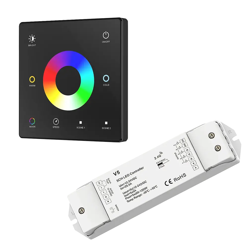 Zestaw sterownika LED radiowego RGB+CCT Skydance, to gotowy asortyment, składający się z panela naściennego oraz odbiornika LED, który umożliwia sterowanie wielokolorowym oświetleniem LED wraz ze zmianą temperatury barwowej CCT w zakresie 2700-6500K (np. taśma led RGB+CCT). Sterownik ten, umożliwia indywidualny dostęp i obsługę jednej strefy, do której możemy uzyskać dostęp przy pomocy dotykowego panela naściennego. Komunikacja z odbiornikiem jest w pełni bezprzewodowa, ponieważ wykorzystuje sygnał radiowy na poziomie 2,4GHz.
