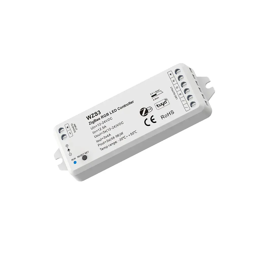 Sterownik LED (ZigBee 3.0) - RGB - 12-36V DC 12A - Tuya - WZS3, to bezprzewodowy kontroler led w formie autonomicznego sterownika led, który umożliwia sterowanie oświetleniem LED składającym się z wielokolorowego oświetlenia LED RGB (np. taśma LED RGB) bez pomocy dodatkowych urządzeń. Cechuje się szerokim zakresem napięcia wejściowego/wyjściowego 12-36V DC oraz obciążalnością wyjściową równą 12A. Sterownik led WZS3 pozwala na ściemnianie/rozjaśnianie oraz zmianę koloru z palety barw RGB z wykorzystaniem komunikacji opartej na protokole ZigBee 3.0. Sterownik led WZS3 pozwala również na komunikacje z aplikacją Tuya, przeznaczoną na nasze urządzenia mobilne (np. smartfony). Sterownik LED WZS3, został wykonany z wysokiej jakości komponentów, które są poprzedzone pięcioletnim okresem gwarancyjnym.