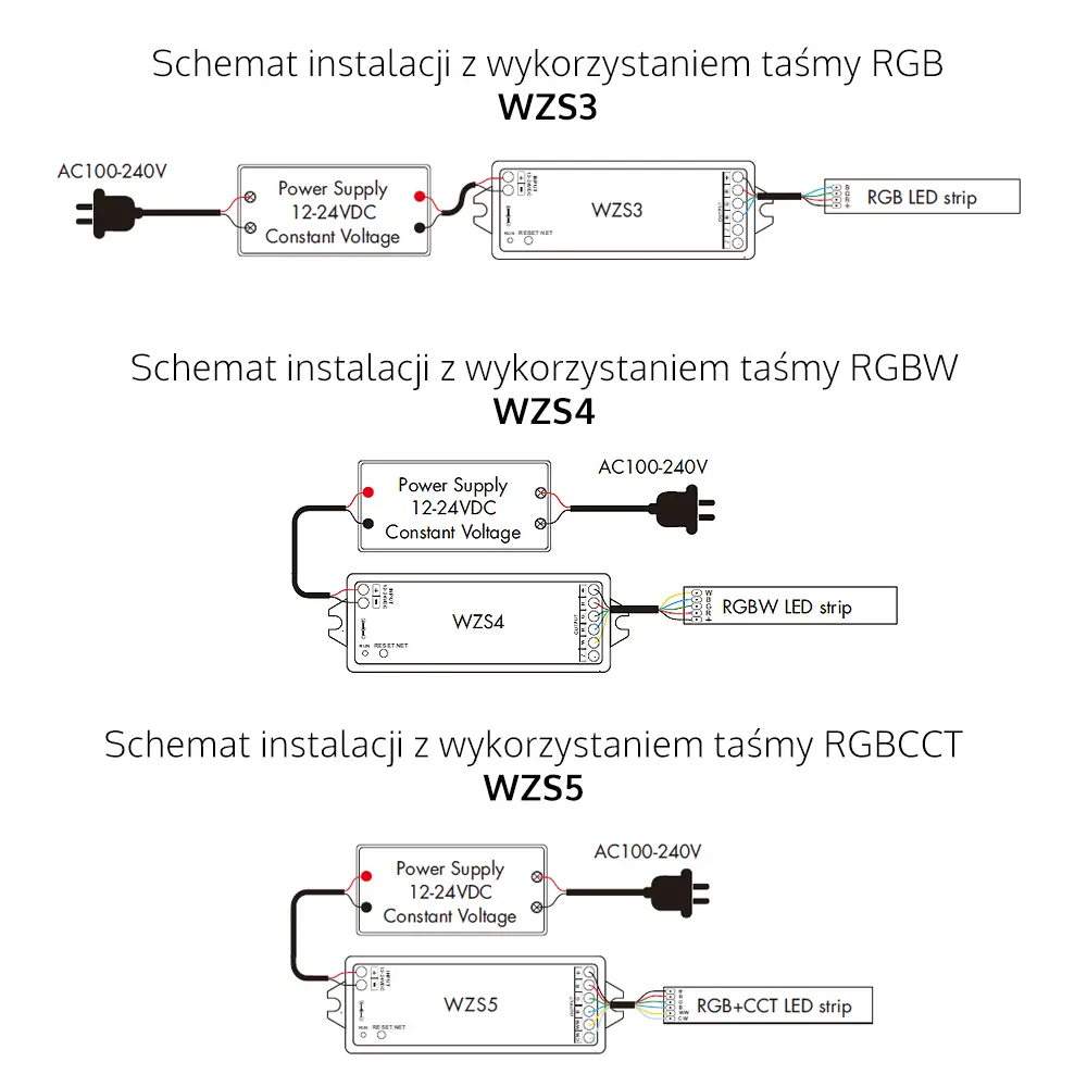 Możliwość wykorzystania sterowników LED WZS do każdej instalacji LED, to ogromny atut pozwalający nam na wykorzystanie tych produktów do każdej taśmy LED. Za równo tych jednokolorowych z możliwością ściemniania bądź rozjaśniania, wielokolorowych RGB z dostępem do każdego koloru czy wielokolorowych z możliwością zmiany temperatury barwowej RGB+CCT. Seria WZS posiada również możliwość dołączenia paneli naściennych zigbee 3.0 czy pilotów radiowych LED zigbee 3.0, które wspierają protokół zigbee 3.0. Sterowniki z tej serii posiadają zazwyczaj mechaniczne bądź dotykowe przyciski, które pracują jako sceny, a więc mogą realizować wiele funkcji jednocześnie. Współpracują również z takimi systemami głosowymi jak Amazon Alexa, Google Assistant, Tmall Genie and Xiaodu, które możemy zsynchronizować z systemem Philips Hue czy Tuya Smart.