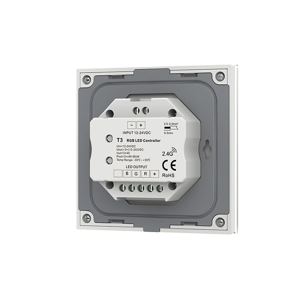 Sterownik LED naścienny - RGB - 1 strefowy - 12-24V DC 12A - T3-K(W) - to przewodowy sterownik LED w formie panelu naściennego, który dedykowany jest dla wielokolorowych instalacji LED RGB (np. taśma LED RGB). Sterownik LED T3-K(W) umożliwia pełną kontrole w postaci załączania oraz wyłączania wraz z uzyskaniem dostępu do ściemniania oświetleniem LED i zmiany koloru RGB przy użyciu przy użyciu obrotowego potencjometru. Sterownik LED naścienny T3-K(W) pozwala na kontrole jednej z dostępnych stref z wykorzystaniem zsynchronizowanej przewodowej łączności. Atutem sterownika LED jest opcjonalna komunikacja radiowa, umożliwiająca rozbudowę instalacji LED o bezprzewodową łączność radiową, wykorzystując do tego dodatkowy odbiornik radiowy bazujący na częstotliwości 2,4Ghz. Pozwala to na sterowanie dodatkowym obwodem oświetleniowym składającym się np. z taśmy LED bez konieczności prowadzenia kolejnych przewodów.