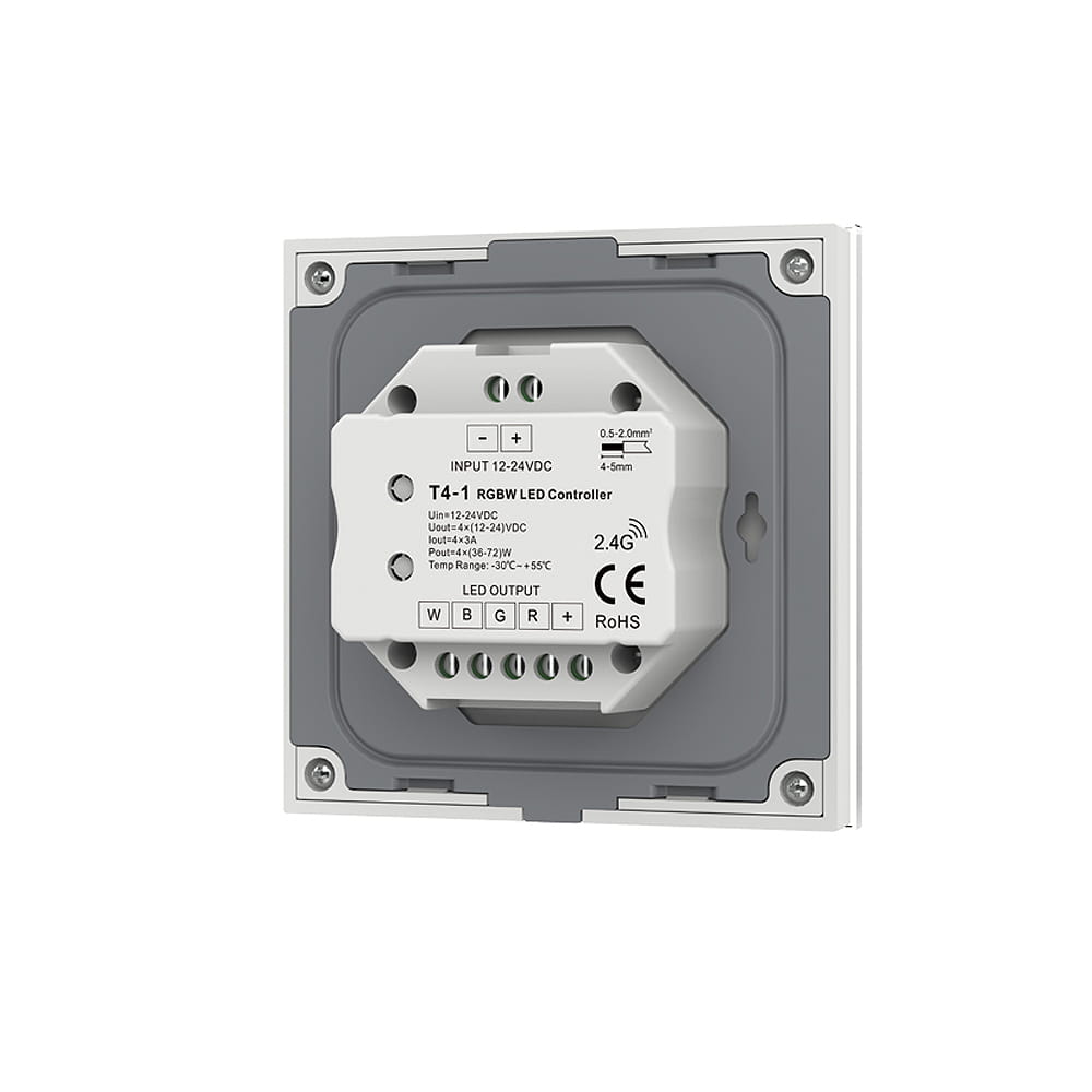 Sterownik LED naścienny - RGB+W - 1 strefowy - 12-24V DC 12A - T4-1(B) - to przewodowy sterownik LED w formie panelu naściennego, który dedykowany jest dla wielokolorowych instalacji LED z dodatkową barwą białą RGBW (np. taśma LED RGB+W). Sterownik LED T4-1(B) umożliwia pełną kontrole w postaci załączania oraz wyłączania wraz z uzyskaniem dostępu do ściemniania oświetleniem LED i zmiany koloru z palety barw RGB przy użyciu dotykowego suwaka oraz pól, które czule reagują na nasz dotyk i są precyzyjne w swoim działaniu. Sterownik LED naścienny T4-1(B) pozwala na kontrole jednej z dostępnych stref z wykorzystaniem zsynchronizowanej przewodowej łączności. Atutem sterownika LED jest opcjonalna komunikacja radiowa, umożliwiająca rozbudowę instalacji LED o bezprzewodową łączność radiową, wykorzystując do tego dodatkowy odbiornik radiowy bazujący na częstotliwości 2,4Ghz. Pozwala to na sterowanie dodatkowym obwodem oświetleniowym składającym się np. z taśmy LED bez konieczności prowadzenia kolejnych przewodów.