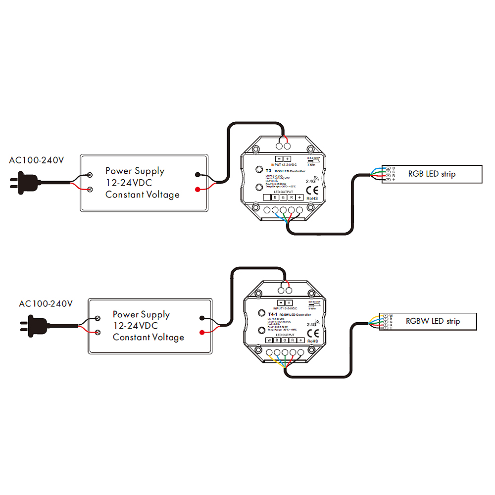 Sterownik LED naścienny - RGB+W - 1 strefowy - 12-24V DC 12A - T4-1(W) - to przewodowy sterownik LED w formie panelu naściennego, który dedykowany jest dla wielokolorowych instalacji LED z dodatkową barwą białą RGBW (np. taśma LED RGB+W). Sterownik LED T4-1(W) umożliwia pełną kontrole w postaci załączania oraz wyłączania wraz z uzyskaniem dostępu do ściemniania oświetleniem LED i zmiany koloru z palety barw RGB przy użyciu dotykowego suwaka oraz pól, które czule reagują na nasz dotyk i są precyzyjne w swoim działaniu. Sterownik LED naścienny T4-1(W) pozwala na kontrole jednej z dostępnych stref z wykorzystaniem zsynchronizowanej przewodowej łączności. Atutem sterownika LED jest opcjonalna komunikacja radiowa, umożliwiająca rozbudowę instalacji LED o bezprzewodową łączność radiową, wykorzystując do tego dodatkowy odbiornik radiowy bazujący na częstotliwości 2,4Ghz. Pozwala to na sterowanie dodatkowym obwodem oświetleniowym składającym się np. z taśmy LED bez konieczności prowadzenia kolejnych przewodów.