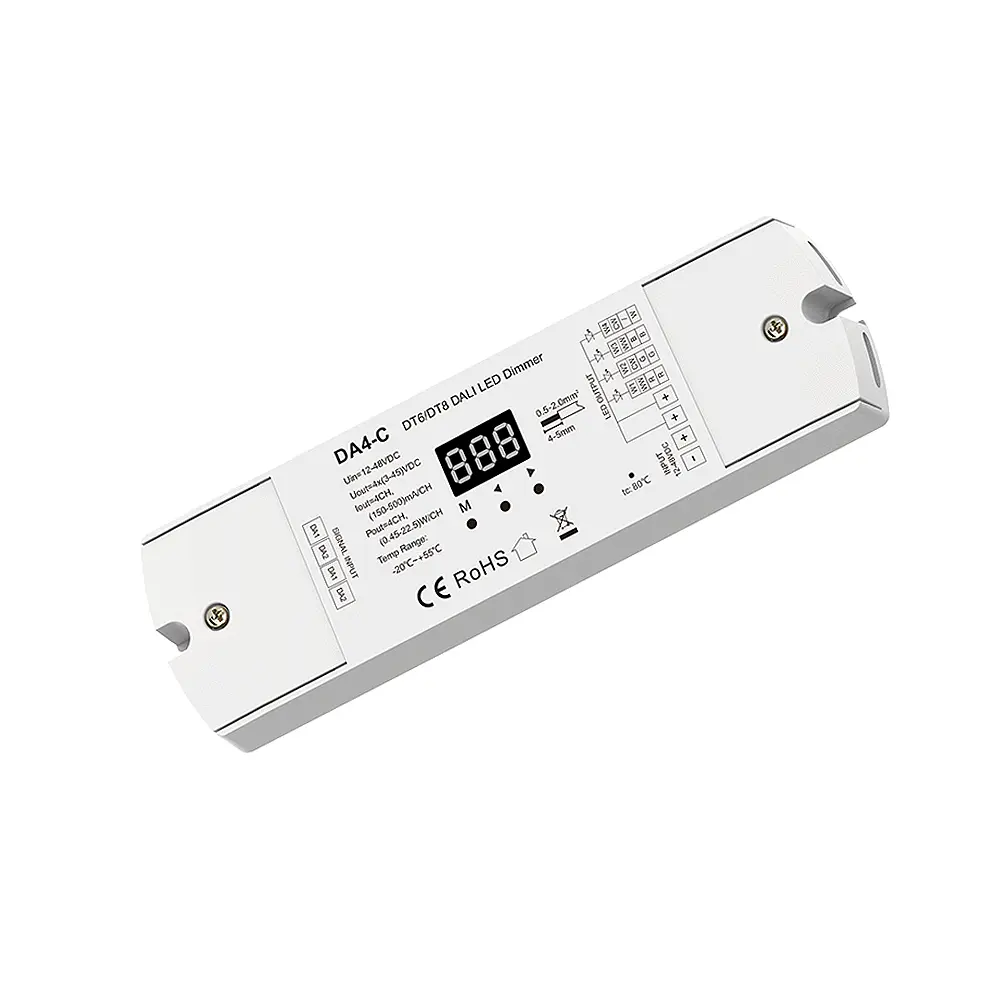 To urządzenie odbiorcze, służące do uzyskania kontroli nad instalacją oświetlenia LED posiadającą określony prąd wyjściowy o wartości 350-1200mA (np. diody LED). Odbiornik prądowy DA4-C umożliwia dostęp do czterech wyjść, do których podłączone oświetlenie led może być dowolnie sterowane za pomocą systemu sterowania DALI. Sterownik DALI DA4-C umożliwia regulacje koloru RGB, temperatury barwowej CCT w zakresie 2700-6500K oraz jasności za sprawą trybu pracy w standardzie DT6 oraz DT8. Podstawową formą komunikacji odbiornika DA4-C jest przewodowe podłączenie z główną magistralą opartą o sieć DALI. Posiada wbudowany wyświetlacz LCD ukazujący aktualny adres urządzenia. Współpracuje ze standardowymi protokołami komunikacji - IEC 62386-102, IEC 62386-207, IEC 62386-209.