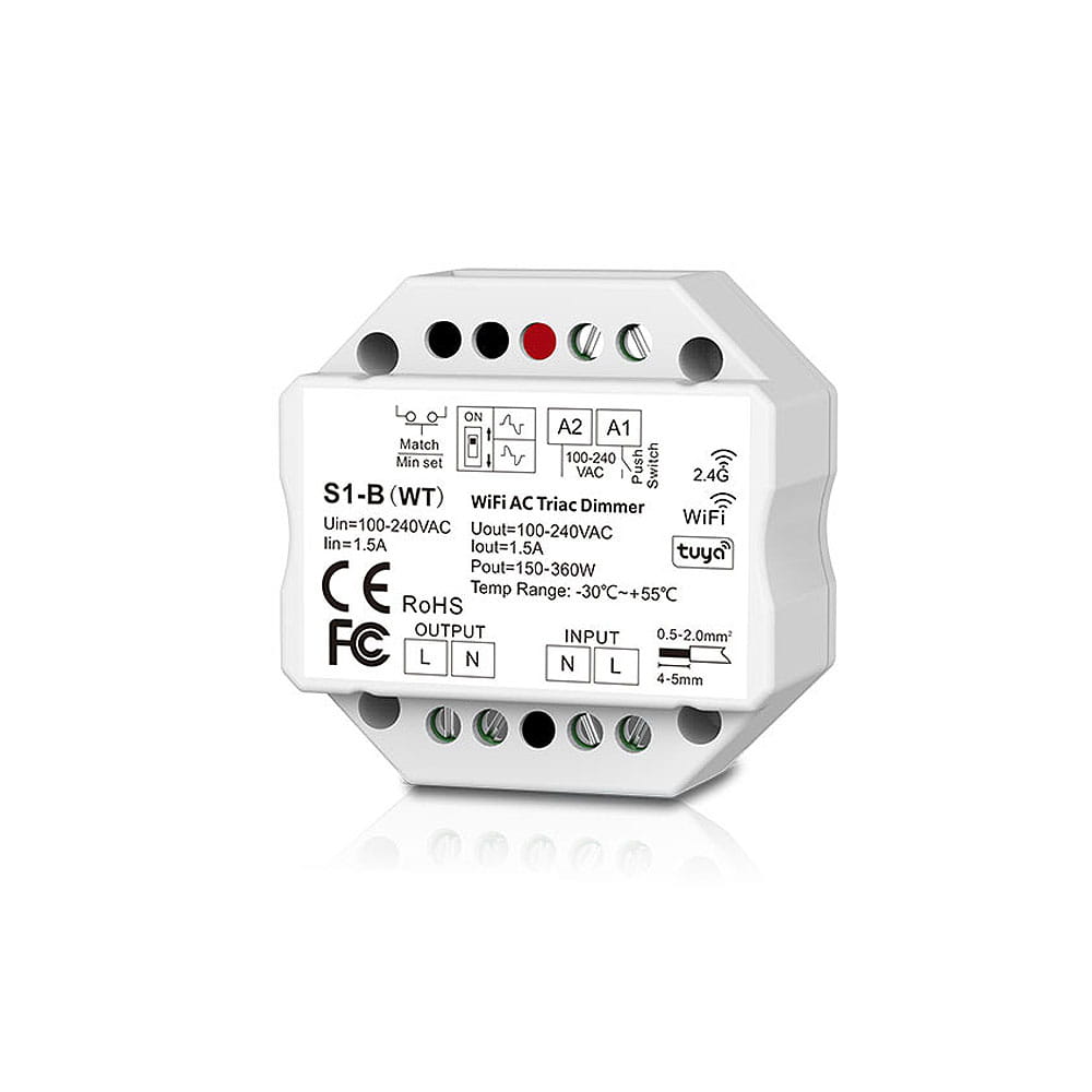 To urządzenie odbiorcze przeznaczone do standardowej puszki fi60, służące do uzyskania kontroli nad żarówkami LED przeznaczonymi na napięcie 230VAC (np. ściemniane żarówki LED). Odbiornik S1-B(WT) umożliwia dostęp do jednego wyjścia do którego możemy podłączyć maksymalnie obciążalność rzędu 200W. Podłączone oświetlenie może być dowolnie ściemniane oraz rozjaśniane za pomocą elementu triakowego znajdującego się w urządzeniu. Podstawową formą komunikacji odbiornika S1-B(WT) jest bezprzewodowa droga radiowa, którą łączy się z pilotem do led bądź panelem naściennym led. Alternatywną formą dostępu do ściemniacza dla żarówek 230VAC jest sterowanie wykorzystujące sieć WiFi.