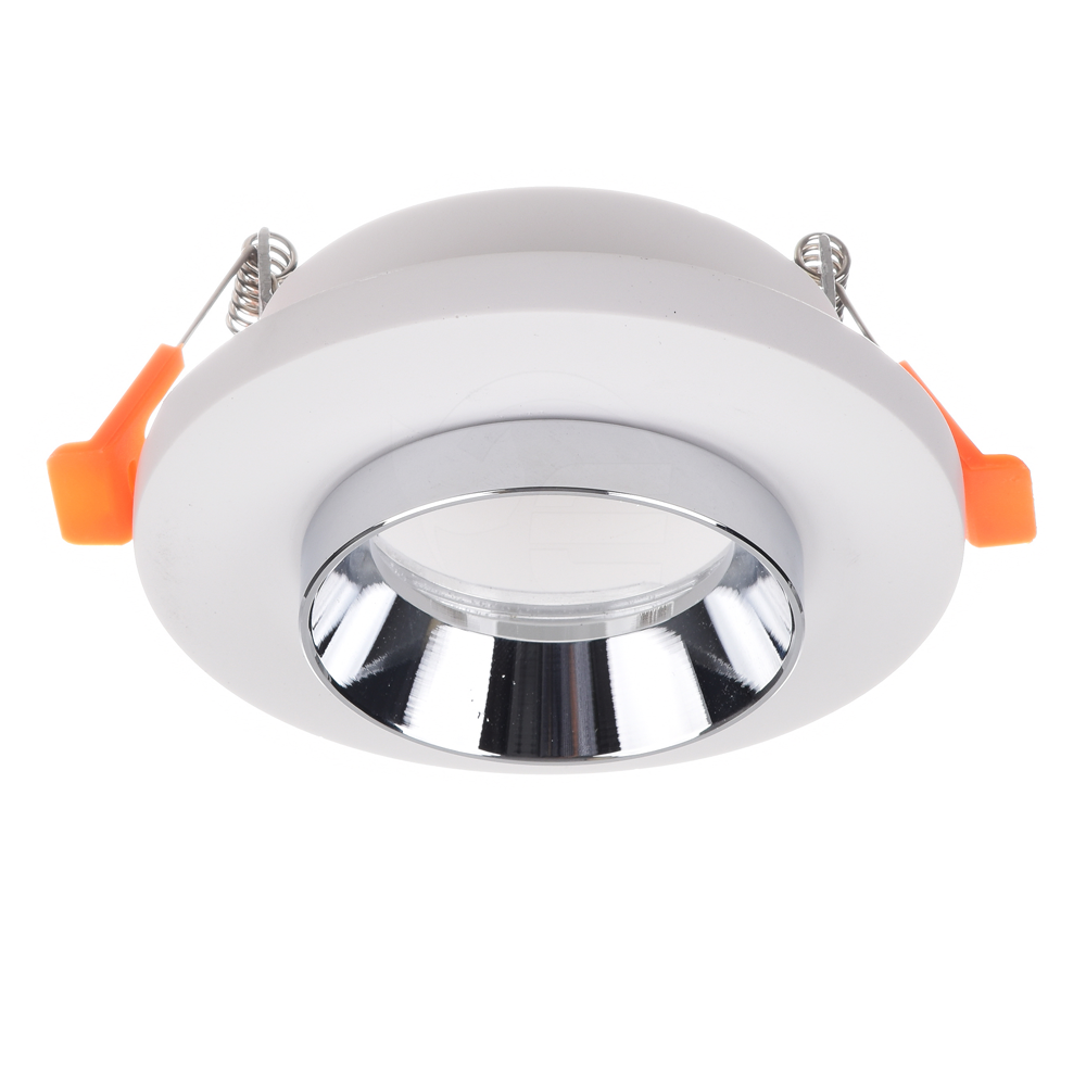 Lampa gipsowa - okrągła w białym kolorze wykonana z wysokiej jakości gipsu przystosowana do montażu żarówek LED z trzonkiem GU10 o maksymalnej mocy 35W. Produkt wykończony ozdobnym chromowanym pierścieniem wykonanym ze stali, dający niesamowity efekt końcowy. Oprawa wyposażona w sprężyny pozwalające na łatwy montaż z wykorzystaniem płyt karton - gips.