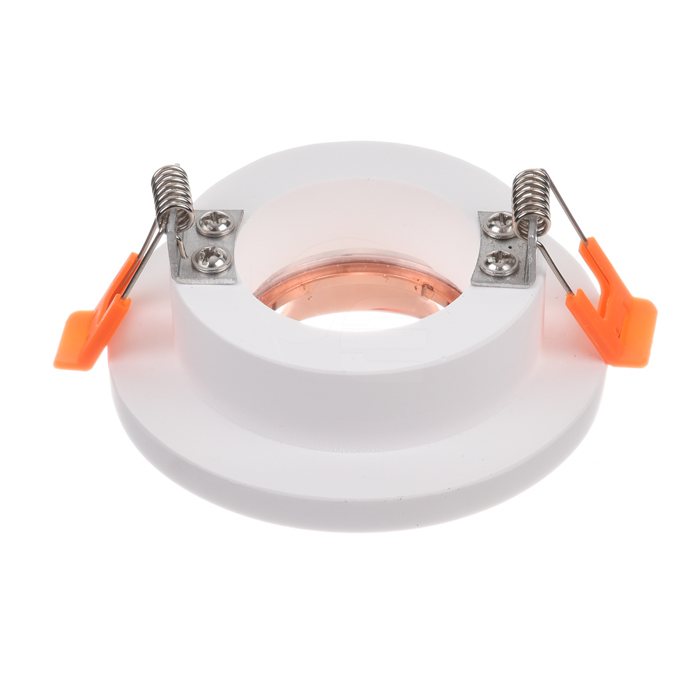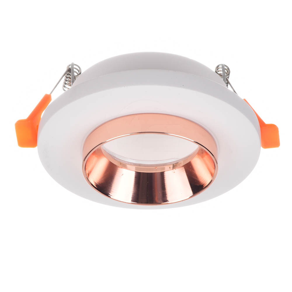 Lampa gipsowa - okrągła w białym kolorze wykonana z wysokiej jakości gipsu przystosowana do montażu żarówek LED z trzonkiem GU10 o maksymalnej mocy 35W. Produkt wykończony ozdobnym pierścieniem wykonanym ze stali w kolorze różowego złota, dający niesamowity efekt końcowy. Oprawa wyposażona w sprężyny pozwalające na łatwy montaż z wykorzystaniem płyt karton - gips.