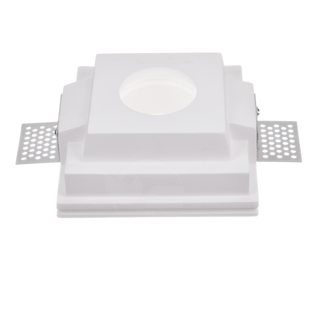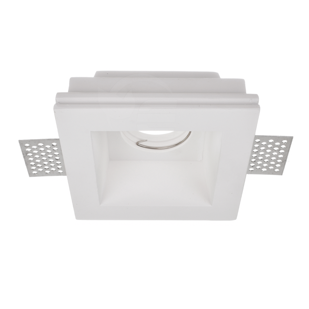 Lampa gipsowa - kwadratowa wykonana z wysokiej jakości gipsu przystosowana do montażu żarówek LED z trzonkiem GU10 o maksymalnej mocy 35W. Oprawa przeznaczona do montażu sufitowego poprzez całkowite jej zabudowanie i zlicowanie z sufitem najczęściej z wykorzystaniem płyt karton - gips. .