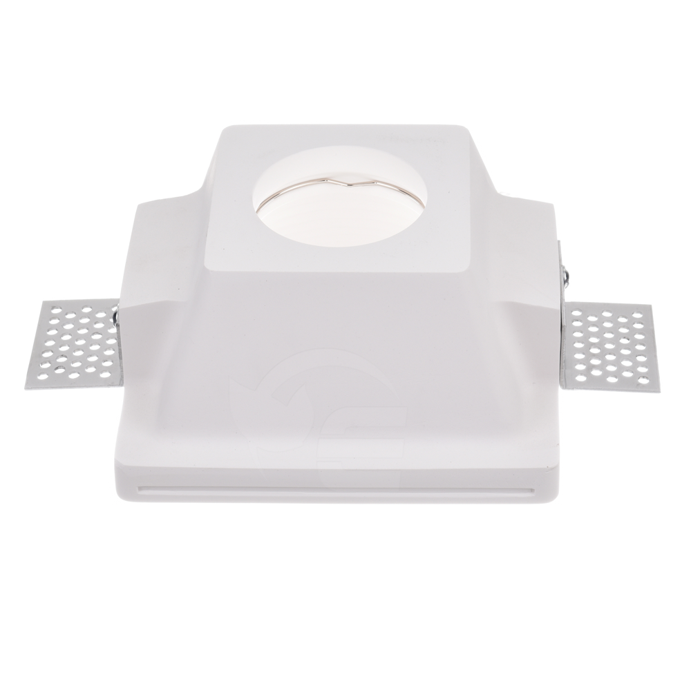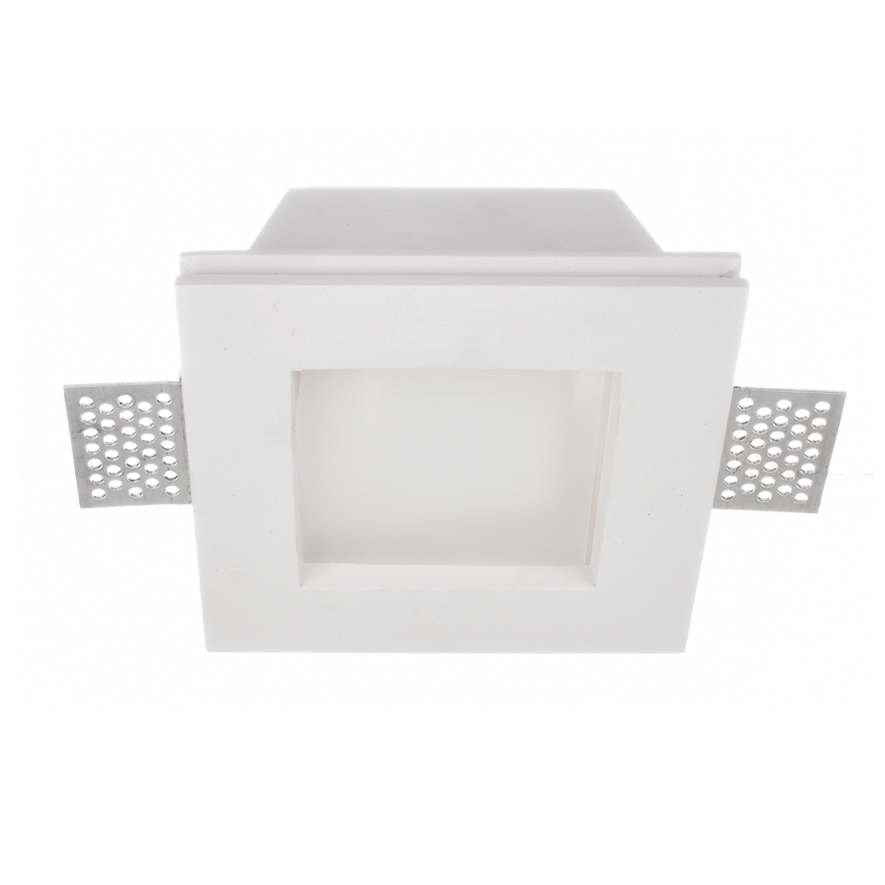 Lampa gipsowa - kwadratowa wykonana z wysokiej jakości gipsu przystosowana do montażu żarówek LED z trzonkiem GU10 o maksymalnej mocy 35W. Produkt dodatkowo posiada szybkę, która przede wszystkim zamyka estetycznie całą oprawę, tak aby zamontowana wewnątrz żarówka była widoczna w znacznie mniejszym stopniu, ale także tworzyć jednolite wykończenie. Oprawa przeznaczona do montażu sufitowego poprzez całkowite jej zabudowanie i zlicowanie z sufitem najczęściej z wykorzystaniem płyt karton - gips.