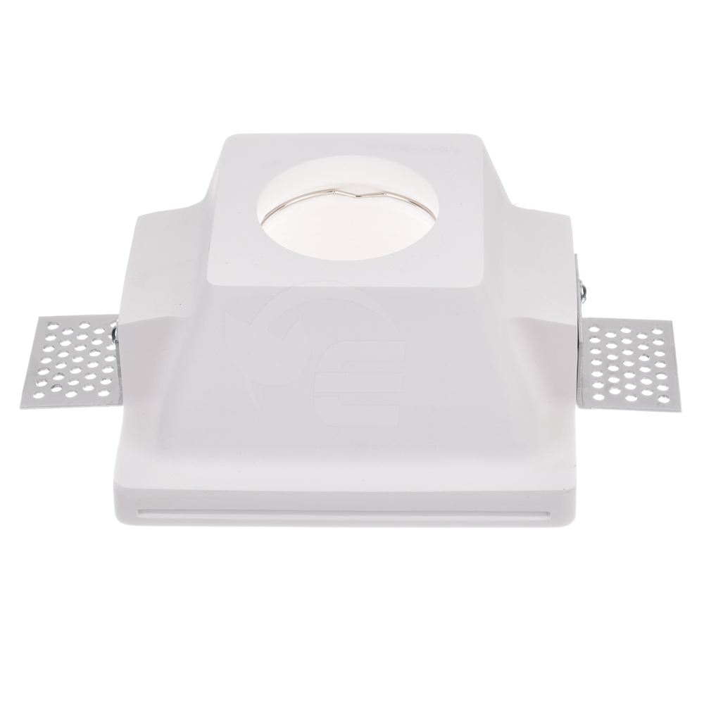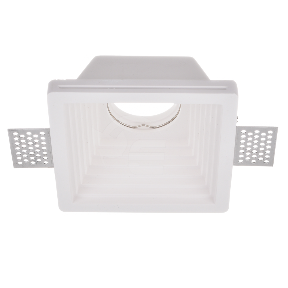 Lampa gipsowa - kwadratowa wykonana z wysokiej jakości gipsu przystosowana do montażu żarówek LED z trzonkiem GU10 o maksymalnej mocy 35W. Oprawa przeznaczona do montażu sufitowego poprzez całkowite jej zabudowanie i zlicowanie z sufitem najczęściej z wykorzystaniem płyt karton - gips. Dzięki wykorzystaniu ryflowania po wewnętrznej stronie oprawy, światło zostaje rozproszone i załamane w sposób dający ciekawy i nadający pomieszczeniu unikatowy wymiar.