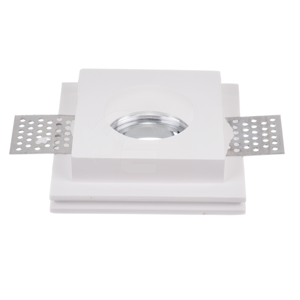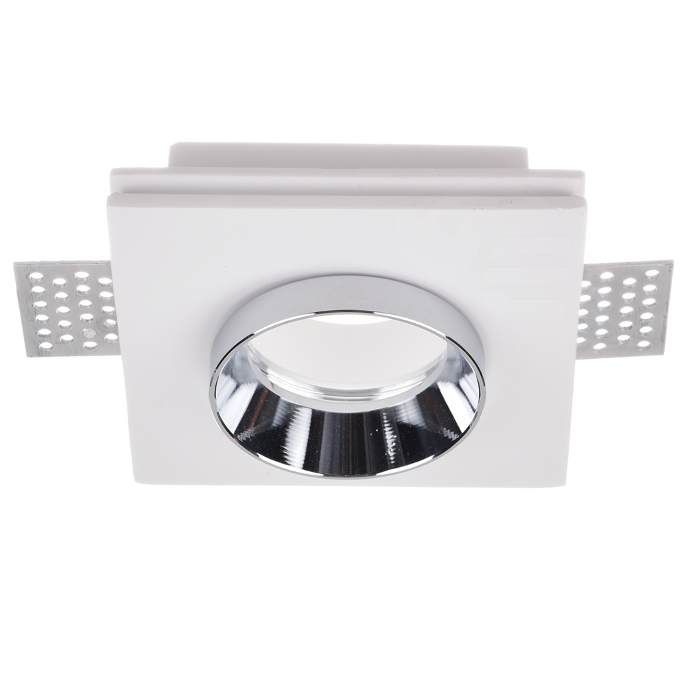 Lampa gipsowa - kwadratowa wykonana z wysokiej jakości gipsu przystosowana do montażu żarówek LED z trzonkiem GU10 o maksymalnej mocy 35W. Produkt wykończony ozdobnym chromowanym pierścieniem wykonanym ze stali, dający niesamowity efekt końcowy. Oprawa przeznaczona do montażu sufitowego poprzez całkowite jej zabudowanie i zlicowanie z sufitem najczęściej z wykorzystaniem płyt karton - gips.
