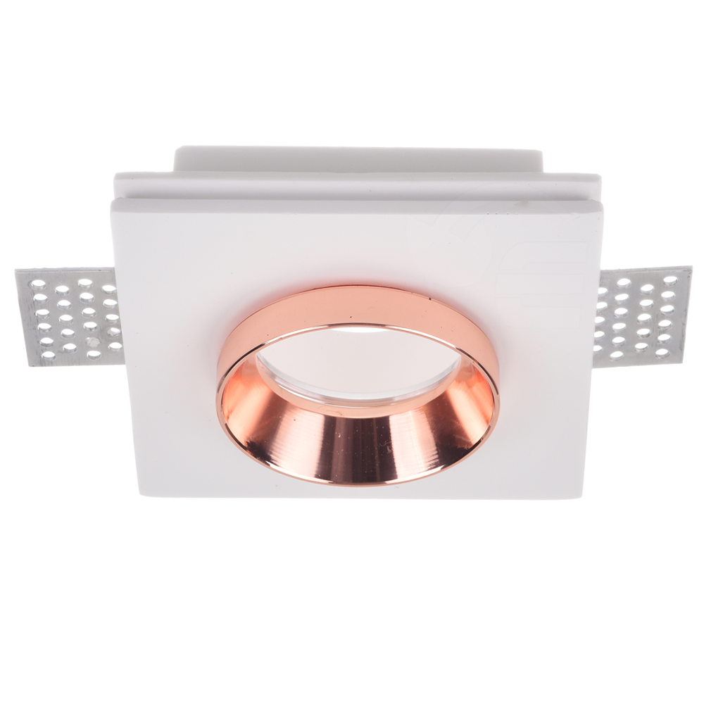 Lampa gipsowa - kwadratowa wykonana z wysokiej jakości gipsu przystosowana do montażu żarówek LED z trzonkiem GU10 o maksymalnej mocy 35W. Produkt wykończony ozdobnym pierścieniem wykonanym ze stali w kolorze różowego złota, dający niesamowity efekt końcowy. Oprawa przeznaczona do montażu sufitowego poprzez całkowite jej zabudowanie i zlicowanie z sufitem najczęściej z wykorzystaniem płyt karton - gips.