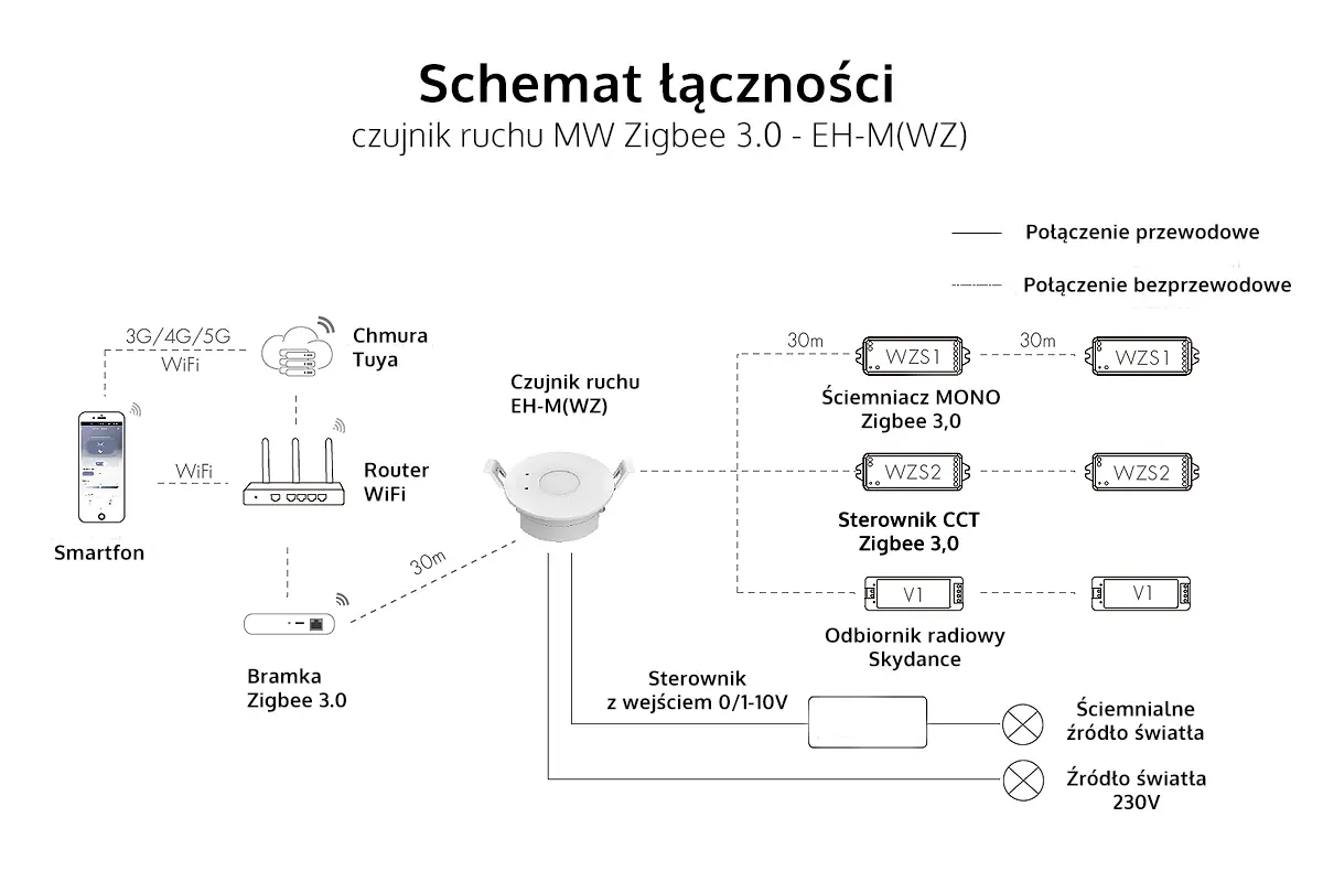 Schemat podłączenia czujnika ruchu Skydance EH-M(WZ), będzie różnił się w zależności od jego wykorzystania. Jeśli zależy Wam na klasycznym działaniu czujnika ruchu, to wystarczy, że na wyjście podłączycie źródło światła 230V. Można również wykorzystać dodatkowe wyjście przeznaczone dla lamp LED bądź sterowników posiadających wejście 0/1-10V. Dodatkowo wzburzony sygnał czujnika ruchu może być przekazany bezprzewodowo poprzez drogę radiową np. do odbiornika Skydance, który pozwala na podłączenie taśmy LED.