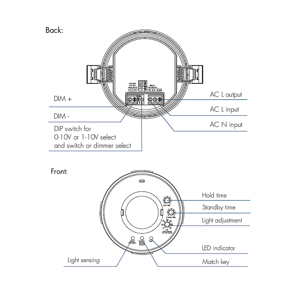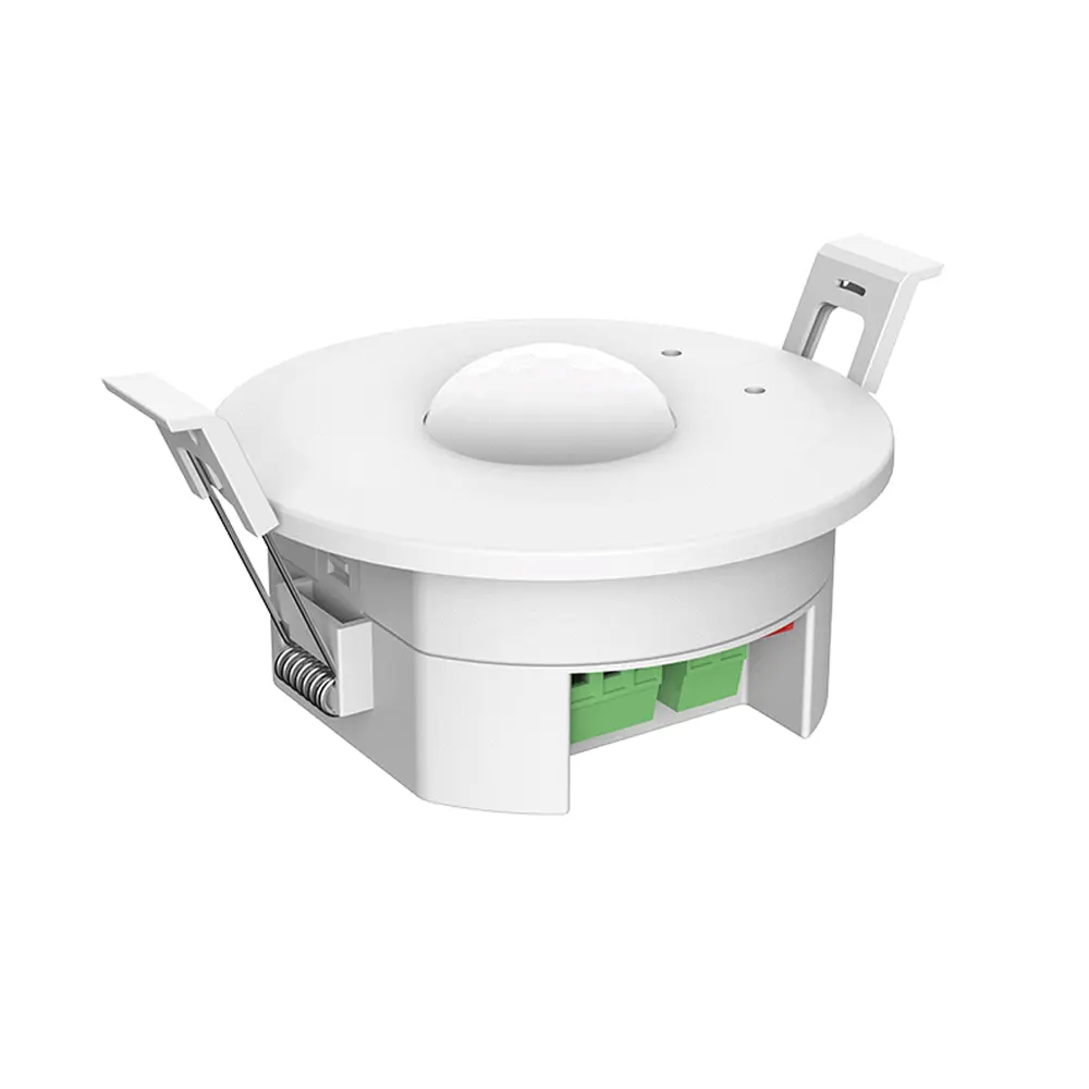 Sufitowy czujnik ruchu wpuszczany PIR (120°) - 230V 900W - wyjście 0/1-10V + RF 2,4GHz - EH-R, to innowacyjny czujnik ruchu służący do sterowania oświetleniem LED nieprzekraczającym sumarycznej mocy 900W. Działa on na zasadzie wykrywania ciepła wypromieniowanego w paśmie podczerwieni (PIR) Zasięg detekcji czujnika to 10 metrów przy maksymalnej wysokości 5m. Czujnik ruchu PIR EH-R charakteryzuje się detekcją ruchu w zakresie 120 stopni z możliwością regulacji takich parametrów jak regulacja czasu pracy, czasu podtrzymania oraz światła. Ponadto posiada dwa przyciski typu "DIP" które pozwalają na ustalenie trybu pracy, w jakim ma się znajdować czujnik ruchu EH-R. Może pracować jako włącznik ON/OFF bądź ściemniacz LED.