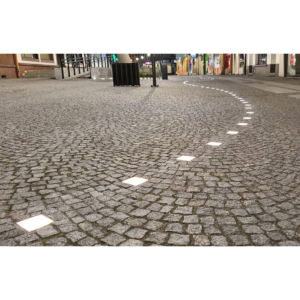 Dzięki dopasowanym odpowiednio wymiarom oraz przetłoczeniom, kostka brukowa LED przystosowana została do wbudowania w odpowiednio przygotowane podłoże pomiędzy elementy betonowe aby służyć jako podświetlenie terenów brukowanych.