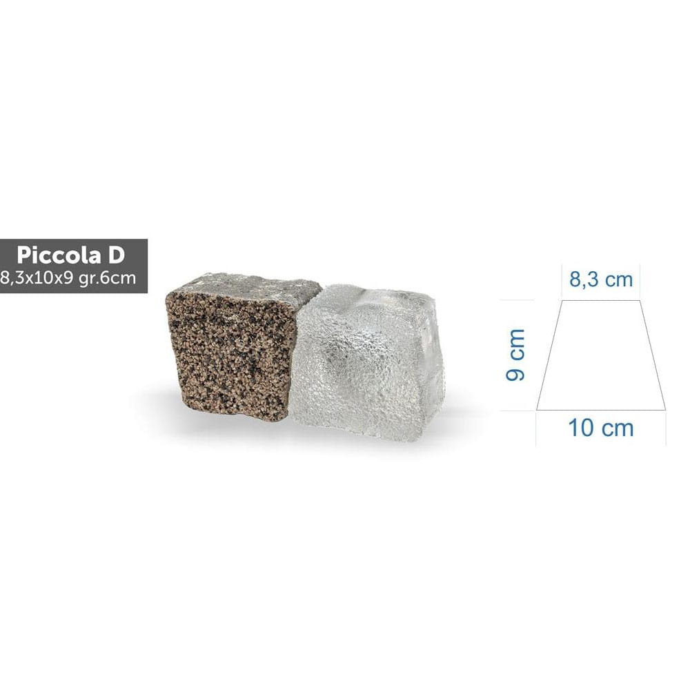 Świecąca kostka brukowa LED to innowatorski rodzaj oświetlenia terenów brukowych i oświetlenia ogrodowego, wzorowany na tradycyjnej kostce brukowej. Model Piccola duża 8,3x9x10x6 cm odpowiada swoim kształtem i rozmiarem do standardowych-betonowych kształtów znanych z brukarstwa.
