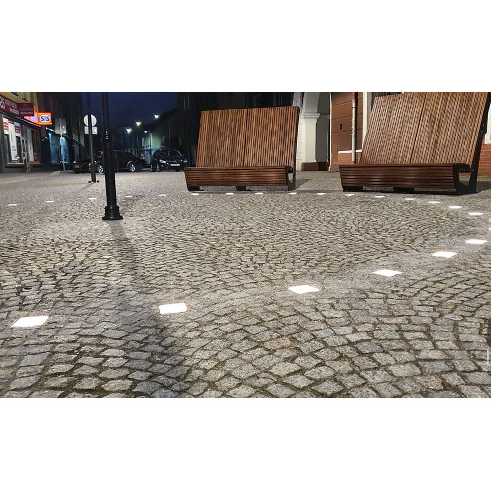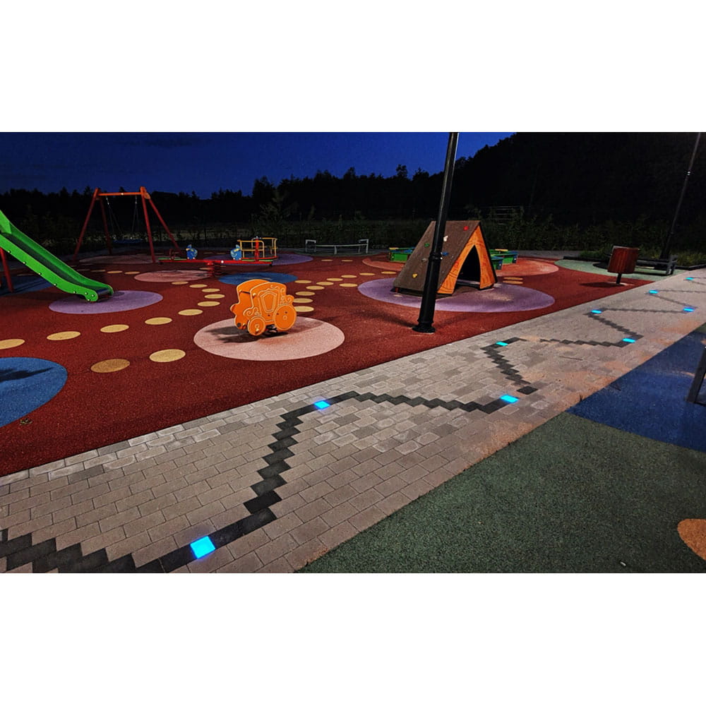 Dzięki dopasowanym odpowiednio wymiarom oraz przetłoczeniom, kostka brukowa LED przystosowana została do wbudowania w odpowiednio przygotowane podłoże pomiędzy elementy betonowe aby służyć jako podświetlenie terenów brukowanych.