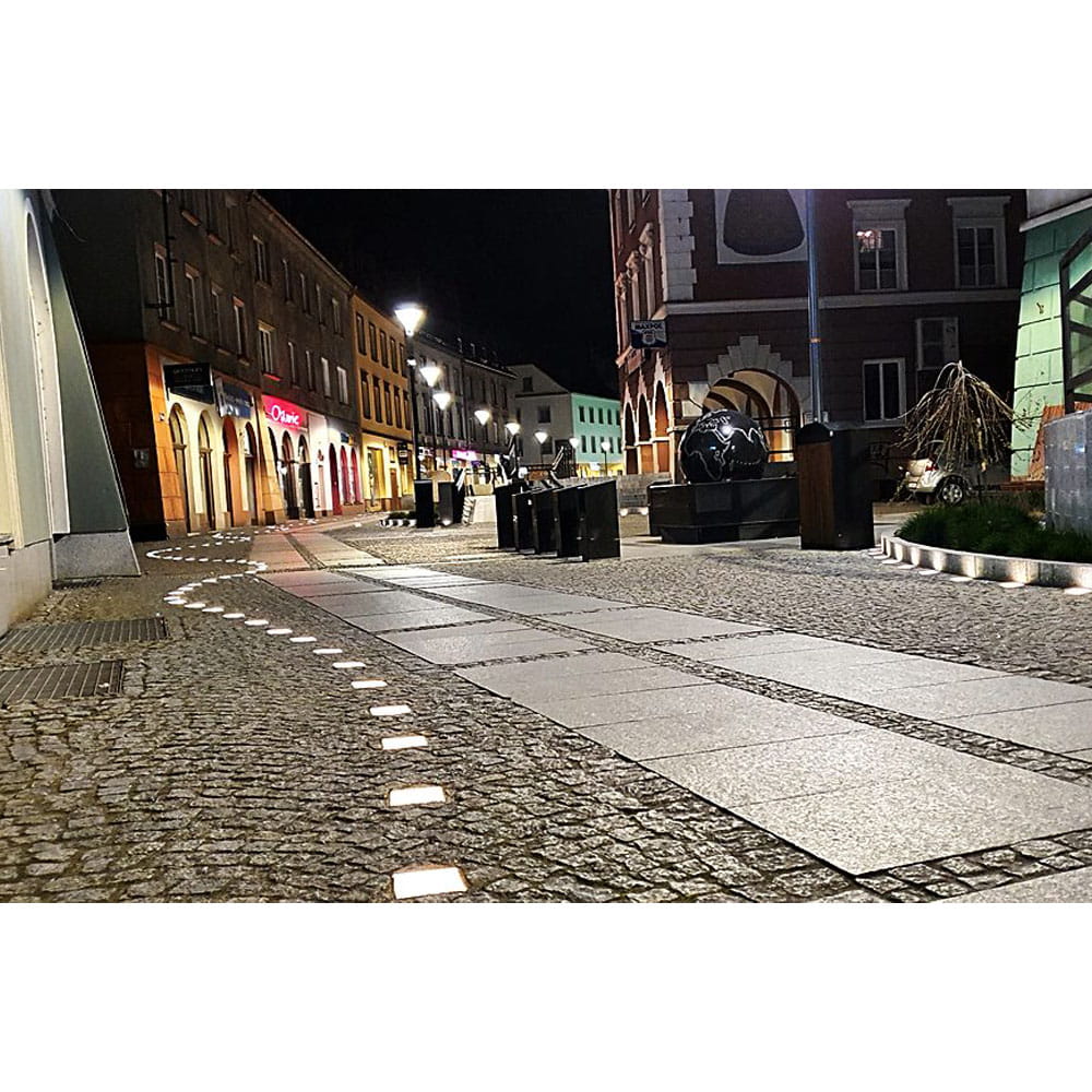 Dzięki dopasowanym odpowiednio wymiarom oraz przetłoczeniom, kostka brukowa LED przystosowana została do wbudowania w odpowiednio przygotowane podłoże pomiędzy elementy betonowe aby służyć jako podświetlenie terenów brukowanych.