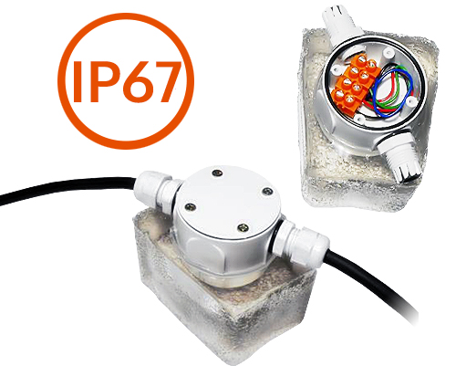 Świecące kamienie ogrodowe LED zawierają hermetyczną puszkę montażową IP67 scaloną z oprawą, która to zapewnia wyjątkowo prostą instalację i służy do rozgałęziania przewodów zasilających (od 5 mm - 15 mm), zapewniając połączeniom hermetyczność o parametrze IP67. W ofercie znają Państwo również same puszki hermetyczne, jako osobne komponenty, które mogą być niezbędne np. przy rozgałęzianiu instalacji oświetleniowej.