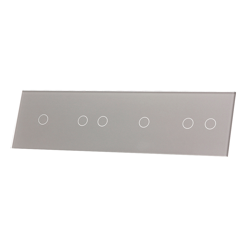 Szklany panel dotykowy poczwórny srebrny - 6-sekcyjny - 701212-64 - LIVOLO, to element dedykowany do mechanizmów dotykowych, umożliwiających dotykową kontrole nad podłączonym źródłem światła, wykorzystując przy tym podświetlane pola dotykowe. Szklany panel dotykowy wykonany jest z hartowanego krystalicznego szkła o grubości 4mm, które nadaje elegancji wnętrzom i jest łatwe w utrzymaniu czystości. Dotykowy szklany panel umożliwia kontrole nad sześcioma sekcjami w konfiguracji 1+2+1+2.