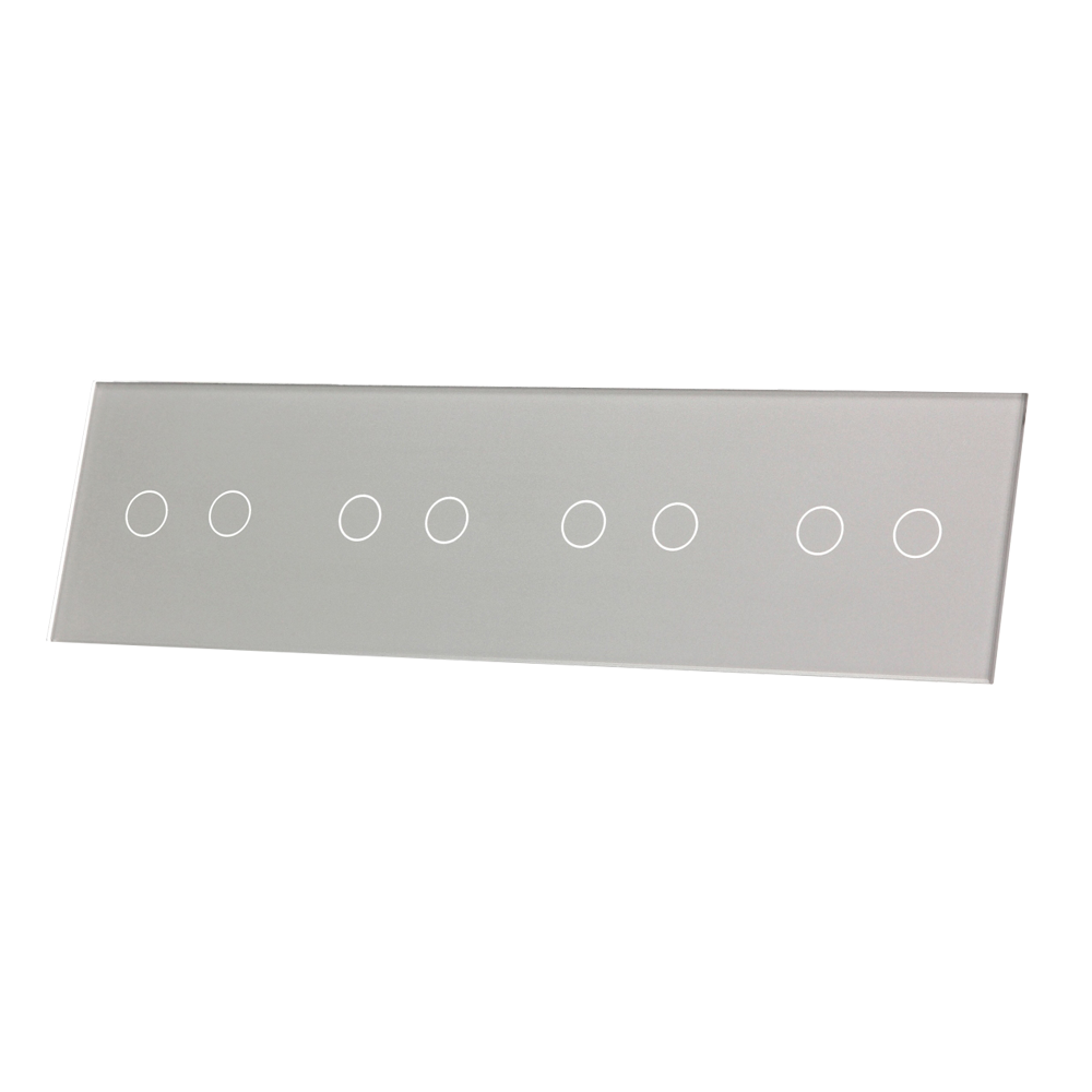 Szklany panel dotykowy poczwórny srebrny - 8-sekcyjny - 702222-64 - LIVOLO, to element dedykowany do mechanizmów dotykowych, umożliwiających dotykową kontrole nad podłączonym źródłem światła, wykorzystując przy tym podświetlane pola dotykowe. Szklany panel dotykowy wykonany jest z hartowanego krystalicznego szkła o grubości 4mm, które nadaje elegancji wnętrzom i jest łatwe w utrzymaniu czystości. Dotykowy szklany panel umożliwia kontrole nad ośmioma sekcjami w konfiguracji 2+2+2+2.