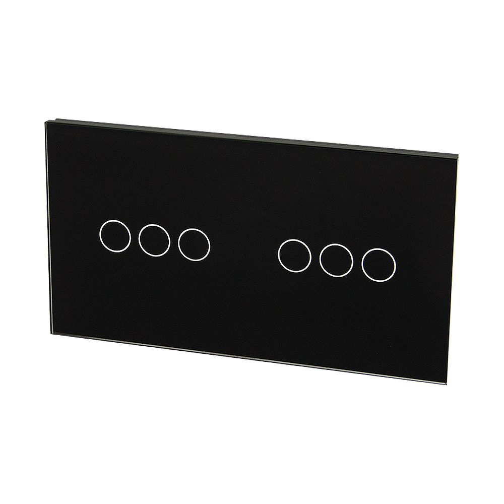 Szklany panel dotykowy podwójny czarny - 6-sekcyjny - TM703703B - TOUCHME, to element dedykowany do mechanizmów dotykowych, umożliwiających dotykową kontrole nad podłączonym źródłem światła, wykorzystując przy tym podświetlane pola dotykowe. Szklany panel dotykowy wykonany jest z hartowanego szkła o grubości 3mm, które nadaje elegancji wnętrzom i jest łatwe w utrzymaniu czystości. Dotykowy szklany panel umożliwia kontrole nad sześcioma sekcjami w konfiguracji 3+3.
