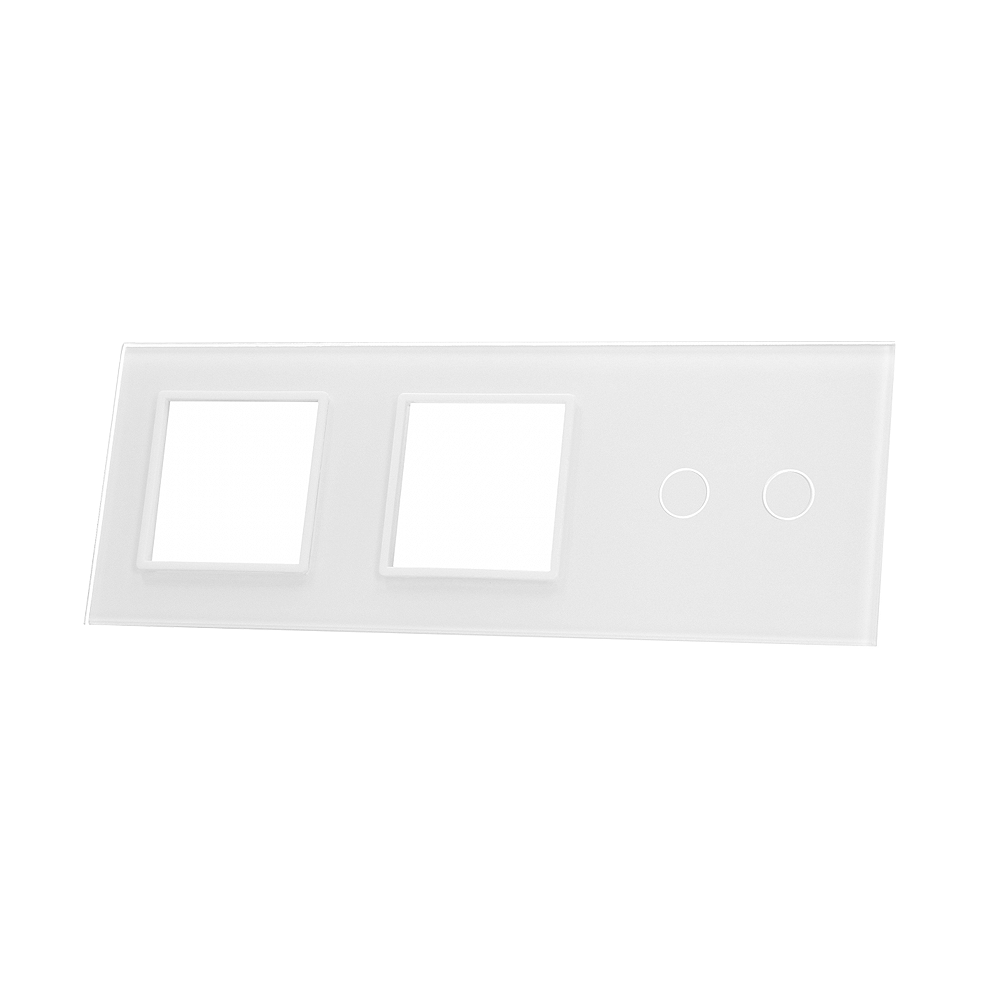 Szklany panel dotykowy potrójny biały z miejscem na osprzęt - 2-sekcyjny + 2 gniazda - 702GG-61 - LIVOLO, to element dedykowany do mechanizmów dotykowych, umożliwiających dotykową kontrole nad podłączonym źródłem światła, wykorzystując przy tym podświetlane pola dotykowe. Szklany panel dotykowy wykonany jest z hartowanego krystalicznego szkła o grubości 4mm, które nadaje elegancji wnętrzom i jest łatwe w utrzymaniu czystości. Dotykowy szklany panel umożliwia kontrole nad dwiema sekcjami. Szklany panel wyposażony jest dodatkowo w dwa gniazda, pozwalające na zamieszczenie w nich osprzętu elektrycznego, który może się składać np. z gniazdka elektrycznego.