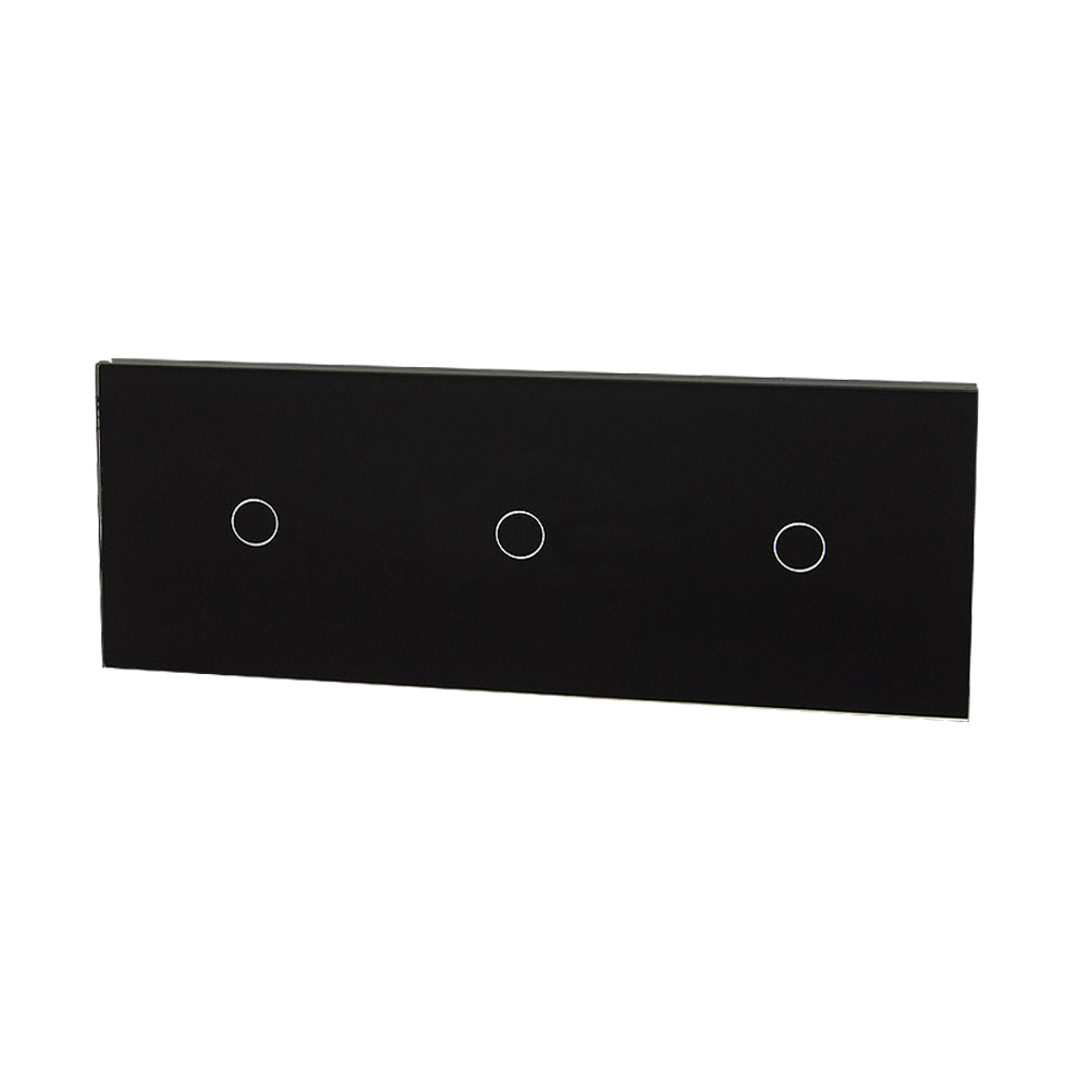 Szklany panel dotykowy potrójny czarny - 3-sekcyjny - TM701701701B - TOUCHME, to element dedykowany do mechanizmów dotykowych, umożliwiających dotykową kontrole nad podłączonym źródłem światła, wykorzystując przy tym podświetlane pola dotykowe. Szklany panel dotykowy wykonany jest z hartowanego szkła o grubości 3mm, które nadaje elegancji wnętrzom i jest łatwe w utrzymaniu czystości. Dotykowy szklany panel umożliwia kontrole nad trzema sekcjami w konfiguracji 1+1+1.