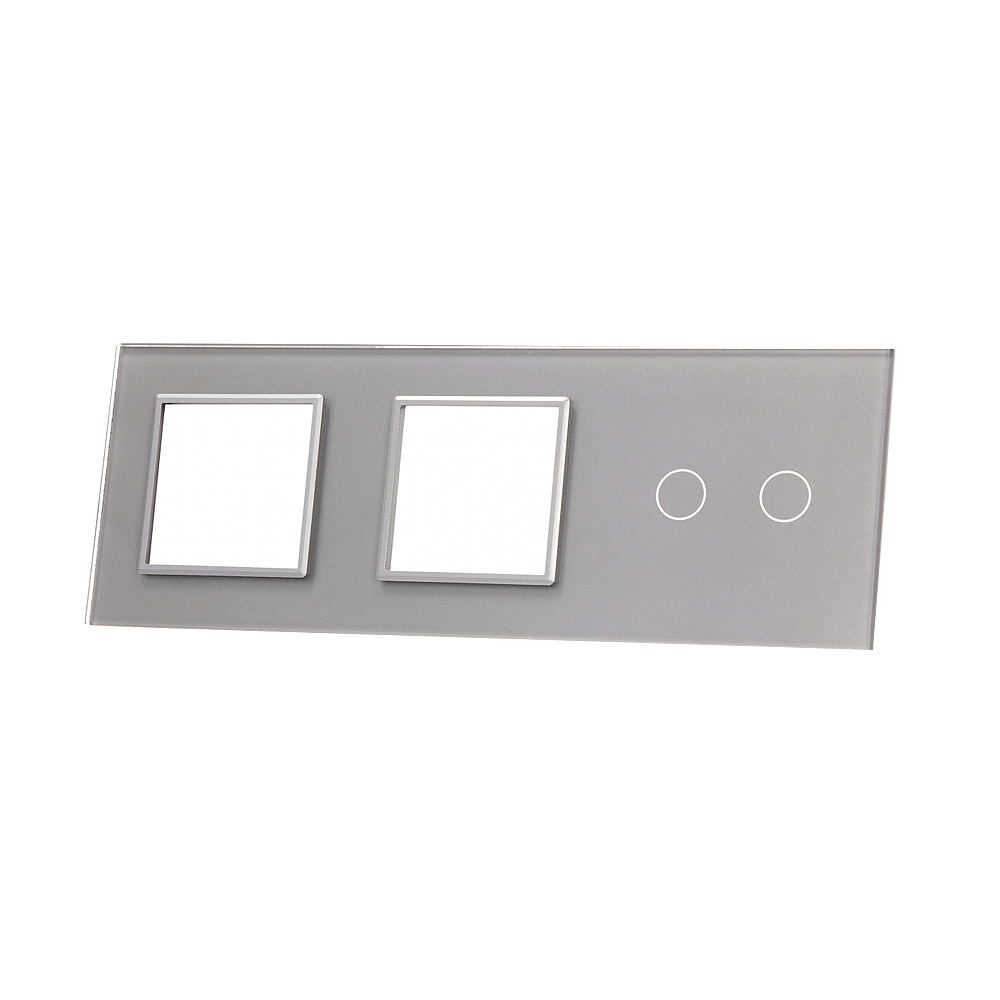 Szklany panel dotykowy potrójny srebrny z miejscem na osprzęt - 2-sekcyjny + 2 gniazda - 702GG-64 - LIVOLO, to element dedykowany do mechanizmów dotykowych, umożliwiających dotykową kontrole nad podłączonym źródłem światła, wykorzystując przy tym podświetlane pola dotykowe. Szklany panel dotykowy wykonany jest z hartowanego krystalicznego szkła o grubości 4mm, które nadaje elegancji wnętrzom i jest łatwe w utrzymaniu czystości. Dotykowy szklany panel umożliwia kontrole nad dwiema sekcjami. Szklany panel wyposażony jest dodatkowo w dwa gniazda, pozwalające na zamieszczenie w nich osprzętu elektrycznego, który może się składać np. z gniazdka elektrycznego.