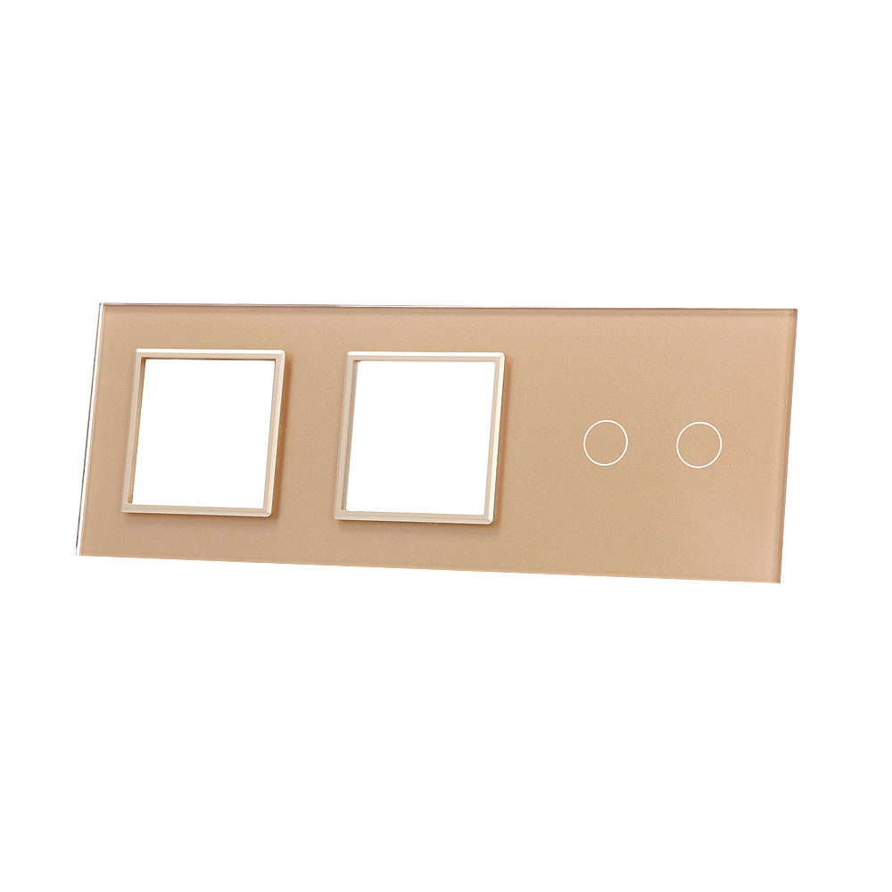 Szklany panel dotykowy potrójny szampański z miejscem na osprzęt - 2-sekcyjny + 2 gniazda - 702GG-63 - LIVOLO, to element dedykowany do mechanizmów dotykowych, umożliwiających dotykową kontrole nad podłączonym źródłem światła, wykorzystując przy tym podświetlane pola dotykowe. Szklany panel dotykowy wykonany jest z hartowanego krystalicznego szkła o grubości 4mm, które nadaje elegancji wnętrzom i jest łatwe w utrzymaniu czystości. Dotykowy szklany panel umożliwia kontrole nad dwiema sekcjami. Szklany panel wyposażony jest dodatkowo w dwa gniazda, pozwalające na zamieszczenie w nich osprzętu elektrycznego, który może się składać np. z gniazdka elektrycznego.