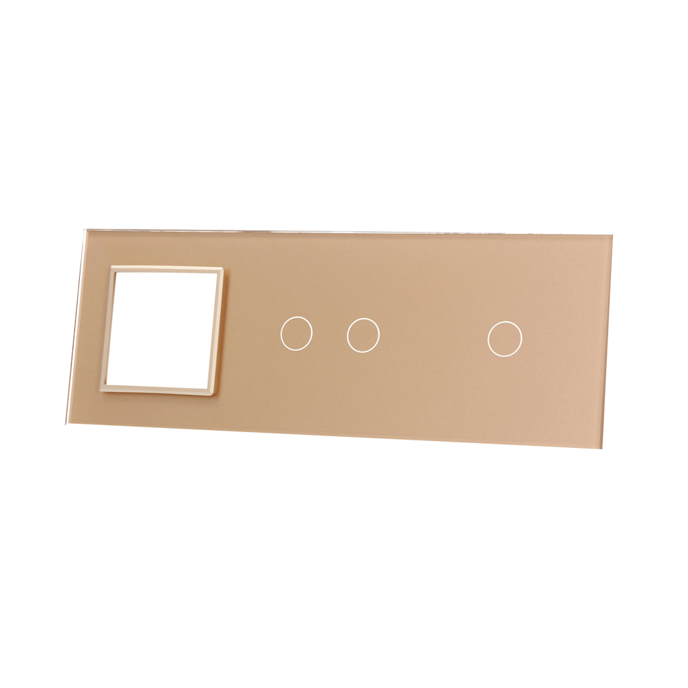 Szklany panel dotykowy potrójny szampański z miejscem na osprzęt - 3-sekcyjny + 1 gniazdo - 7012G-63 - LIVOLO, to element dedykowany do mechanizmów dotykowych, umożliwiających dotykową kontrole nad podłączonym źródłem światła, wykorzystując przy tym podświetlane pola dotykowe. Szklany panel dotykowy wykonany jest z hartowanego krystalicznego szkła o grubości 4mm, które nadaje elegancji wnętrzom i jest łatwe w utrzymaniu czystości. Dotykowy szklany panel umożliwia kontrole nad trzema sekcjami w konfiguracji 1+2. Szklany panel wyposażony jest dodatkowo w jedno gniazdo, pozwalające na zamieszczenie w nim osprzętu elektrycznego, który może się składać np. z gniazdka elektrycznego.