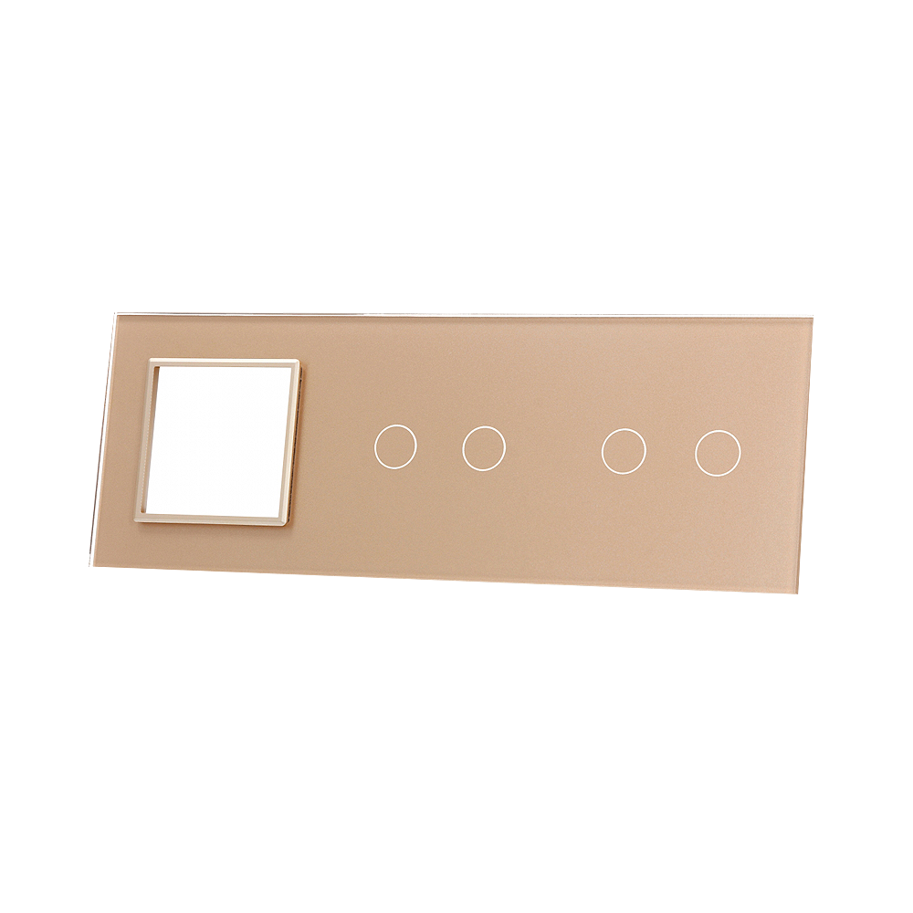 Szklany panel dotykowy potrójny szampański z miejscem na osprzęt - 4-sekcyjny + 1 gniazdo - 7022G-63 - LIVOLO, to element dedykowany do mechanizmów dotykowych, umożliwiających dotykową kontrole nad podłączonym źródłem światła, wykorzystując przy tym podświetlane pola dotykowe. Szklany panel dotykowy wykonany jest z hartowanego krystalicznego szkła o grubości 4mm, które nadaje elegancji wnętrzom i jest łatwe w utrzymaniu czystości. Dotykowy szklany panel umożliwia kontrole nad czterema sekcjami. Szklany panel wyposażony jest dodatkowo w jedno gniazdo, pozwalające na zamieszczenie w nim osprzętu elektrycznego, który może się składać np. z gniazdka elektrycznego.