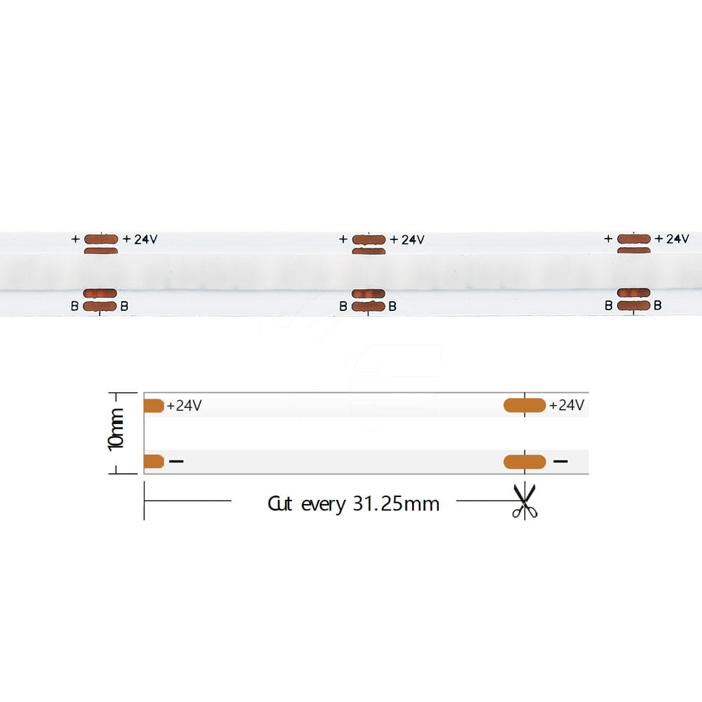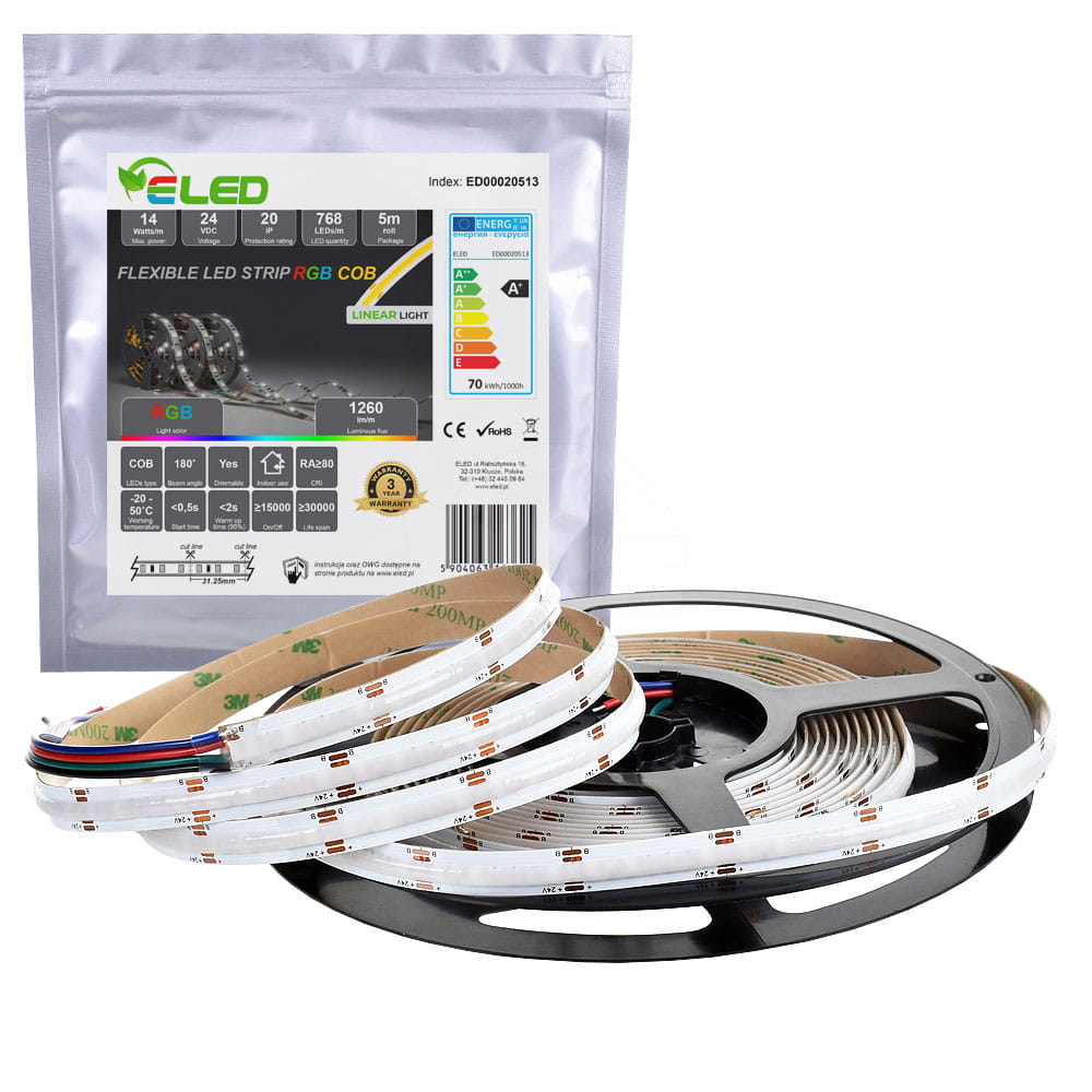 Elastyczna taśma LED COB RGB (wielokolorowa) 768 chips/m 14W 24V IP20 to jeden z najnowszych modeli taśm LED dostępnych na rynku oświetlenia. Przeznaczona jest głównie do aplikacji w których konieczne jest uzyskanie jednolitej linii świetlnej - nawet w przypadku zastosowania jej w bardzo płytkim profilu aluminiowym LED. Prezentowany model taśmy LED COB cechuje również szerszy kąt rozproszenia światła (180°) - aniżeli w taśmach LED opartych na diodach SMD. Przy zastosowaniu tego modelu taśmy COB RGB uzyskujemy możliwość zmiany i mieszania 3 podstawowych kolorów (R+G+B) za pomocą odpowiedniego sterownika LED RGB uzyskując tym samym całą paletę różnych barw.