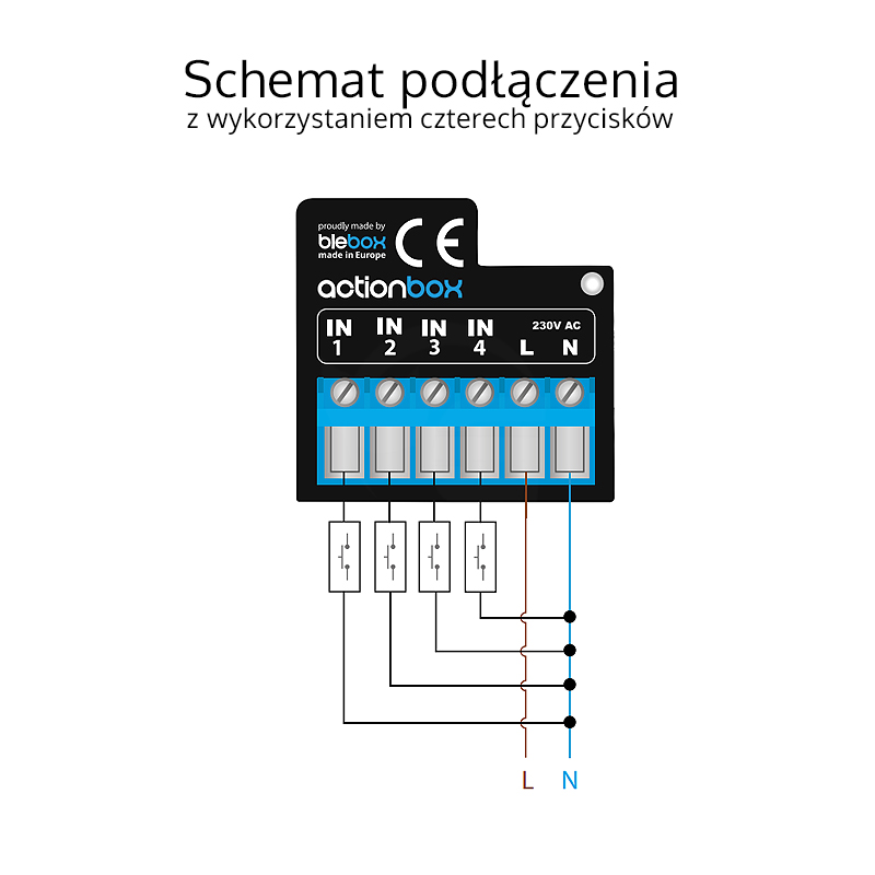 Poglądowy schemat podłączenia - czterokanałowy wyzwalacz akcji actionBox