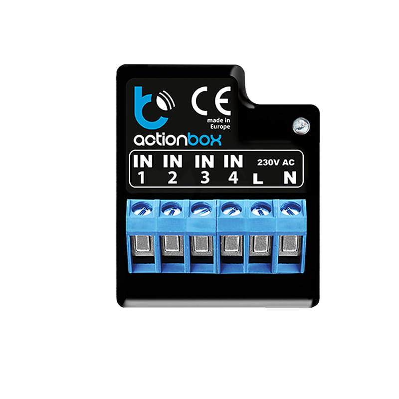Wielofunkcyjny moduł sterujący WiFi actionbox, to niewielkich rozmiarów inteligentny sterownik służący do tworzenia akcji danego urządzenia bądź sterownika z serii polskiego producenta Blebox. Sterownik actionBox posiada cztery wejścia 230V, do których możemy podłączyć włącznik bistabilny bądź zwierny w postaci np. przycisku dzwonkowego, który pozwoli na wyzwolenie stworzonej przez nas akcji. Daną akcję konfigurujemy wykorzystując bezpłatną aplikację wBox, która korzysta z połączenia realizowanego poprzez sieć uWifi. Sterownik wyzwalania akcji actionbox zasilany jest napięciem sieci 230V.