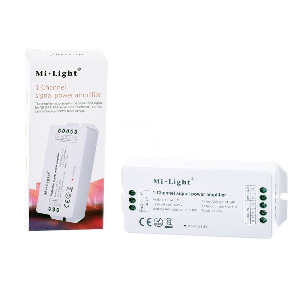 Wzmacniacz magistrali dla systemu SYS – 15A 24VDC – SYS-T2, to urządzenie rozszerzające instalacje LED opartą na zewnętrznych oprawach MiLight (MiBoxer) przeznaczonych dla systemu sterowania Sys Series. Wzmacniacz magistrali SYS-T2 pozwala na podłączenie kolejnych opraw LED takich jak oprawy basenowe, ogrodowe czy najazdowe do istniejącej już instalacji, zwiększając tym samym przesyłanie sygnału przewodowego z magistrali SYS-T1 o dodatkowe 300 metrów. Wzmacniacz zasilany jest bezpiecznym napięciem sieci 24VDC. Maksymalna obciążalność wzmacniacza wynosi 15A, co daje nam równowartość dodatkowych 360W. Wzmacniacz montowany jest nawierzchniowo.