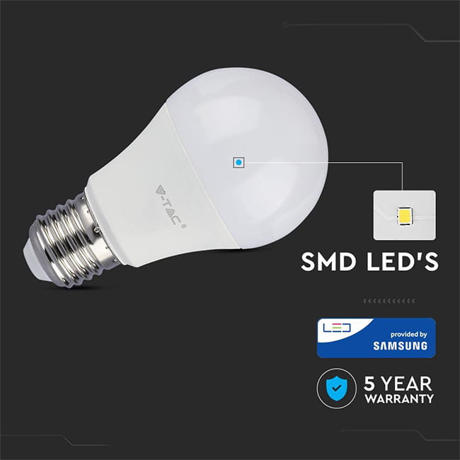 Żarówka LED dekoracyjna E27 A60 6.5W to zamiennik klasycznej żarówki 60W oparty na diodach LED typu SMD-Samsung. Zastosowanie nowego typu diod LED SMD-Samsung pozwoliło na budowę żarówek, które zapewniają większą niezawodność i trwałość. Cechuje ją wysoka skuteczność świetlna oraz szeroki kąt świecenia - wynoszący 200°.