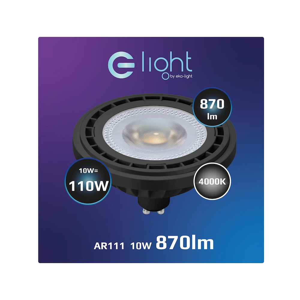 Energooszczędna żarówka LED GU10 AR111 10W w czarnej obudowie, to nowoczesne źródło światła o białej neutralnej barwie (4000K), które pozwala zmniejszyć zużycie energii nawet o 90%, w porównaniu z tradycyjnymi żarówkami halogenowymi. Przedstawiona żarówka LED typu AR111 została wykonana z wysokiej jakości materiałów oraz precyzyjnej elektroniki, co zapewnia długą żywotność i bezawaryjną pracę przez lata.